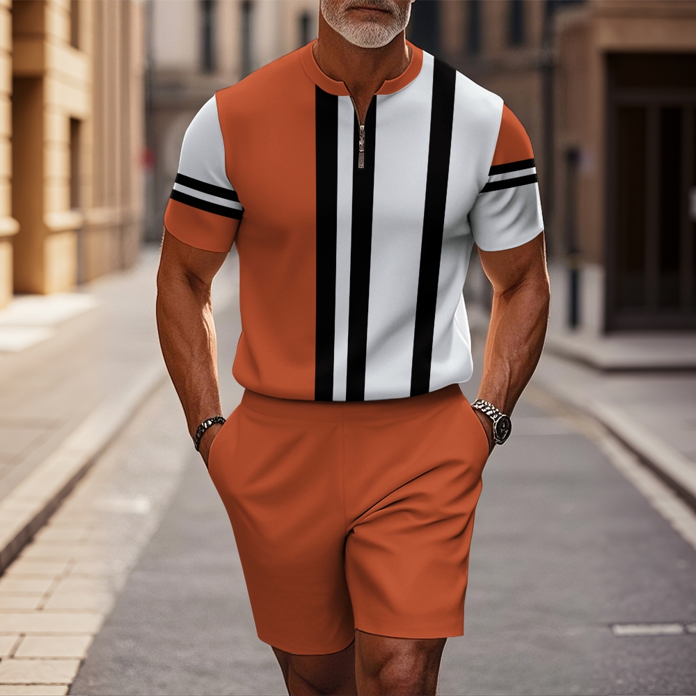 Men's fashion casual round-neck zipper geometric printed short-sleeved two-piece set 2504000252