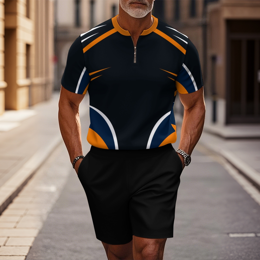 Men's fashion casual round-neck zipper geometric printed short-sleeved two-piece set 2504000265