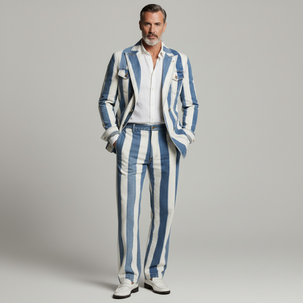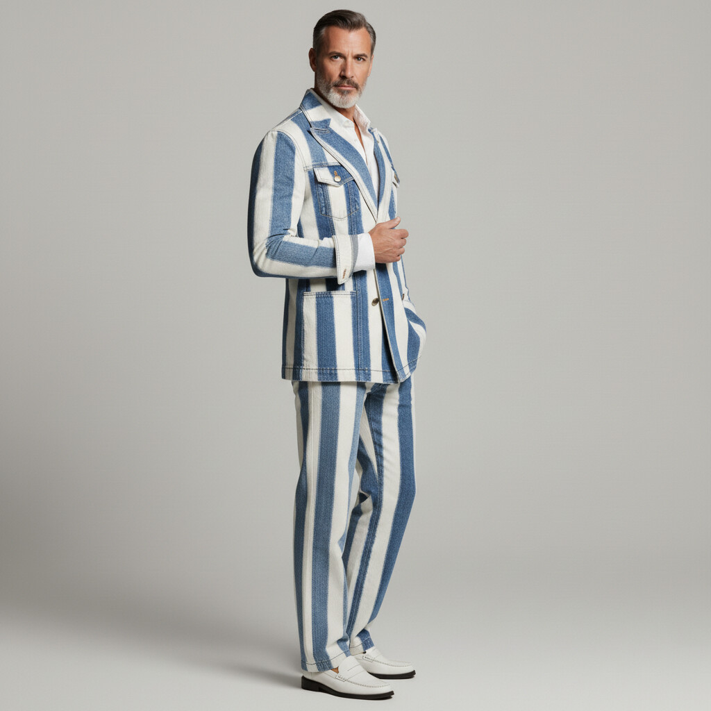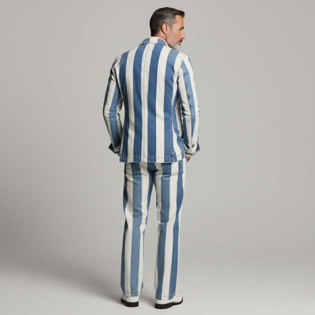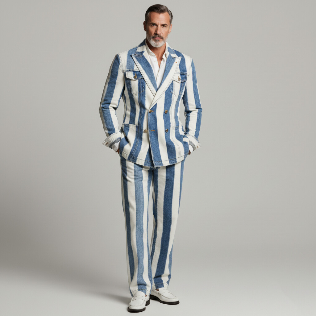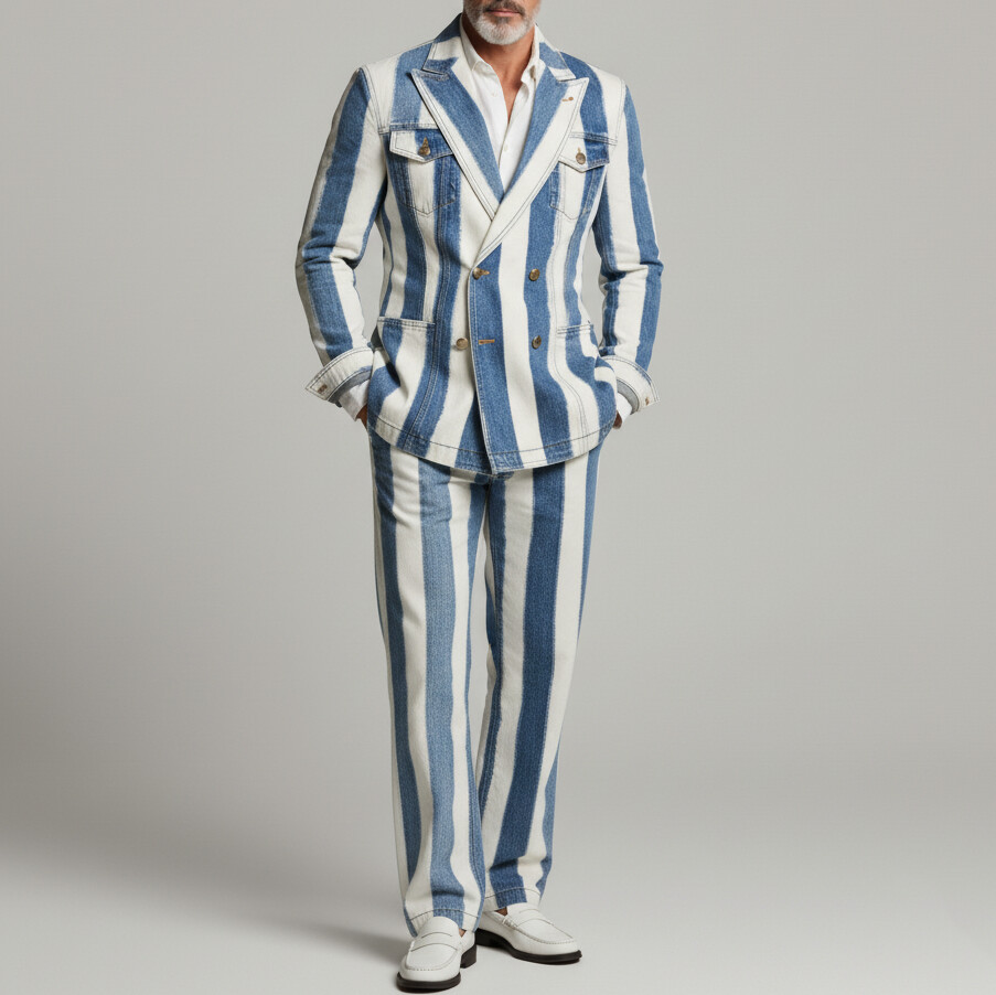 Men's Business Casual Denim Peak Lapel Double Breasted Multi-Pocket Striped Blazer & Pants 2Pcs Suit