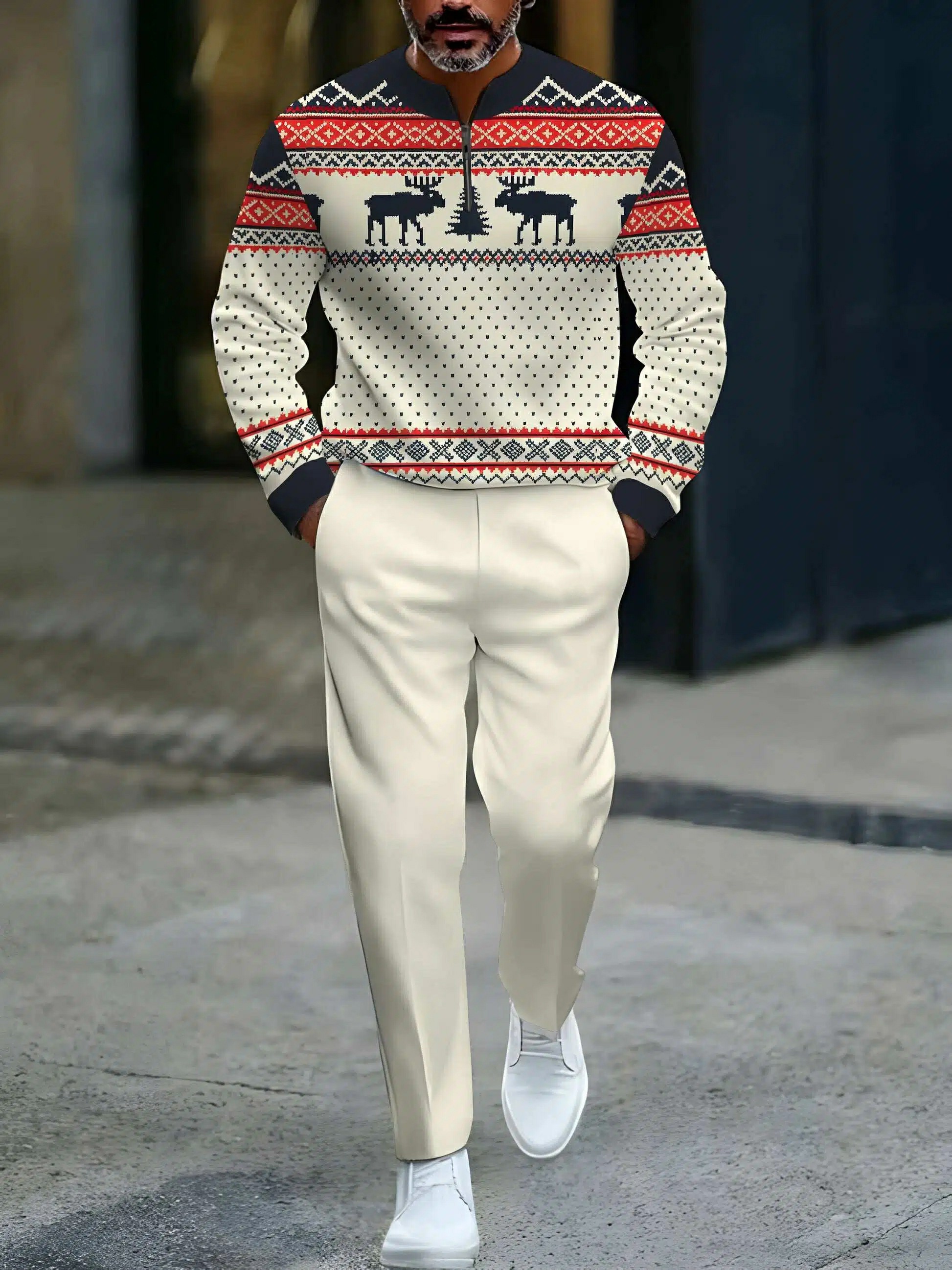 Men's Casual Beige & Navy Color Matching Christmas Printed Round-Neck Zipper Long Sleeved Sweatshirt & Trousers Two-Piece Set