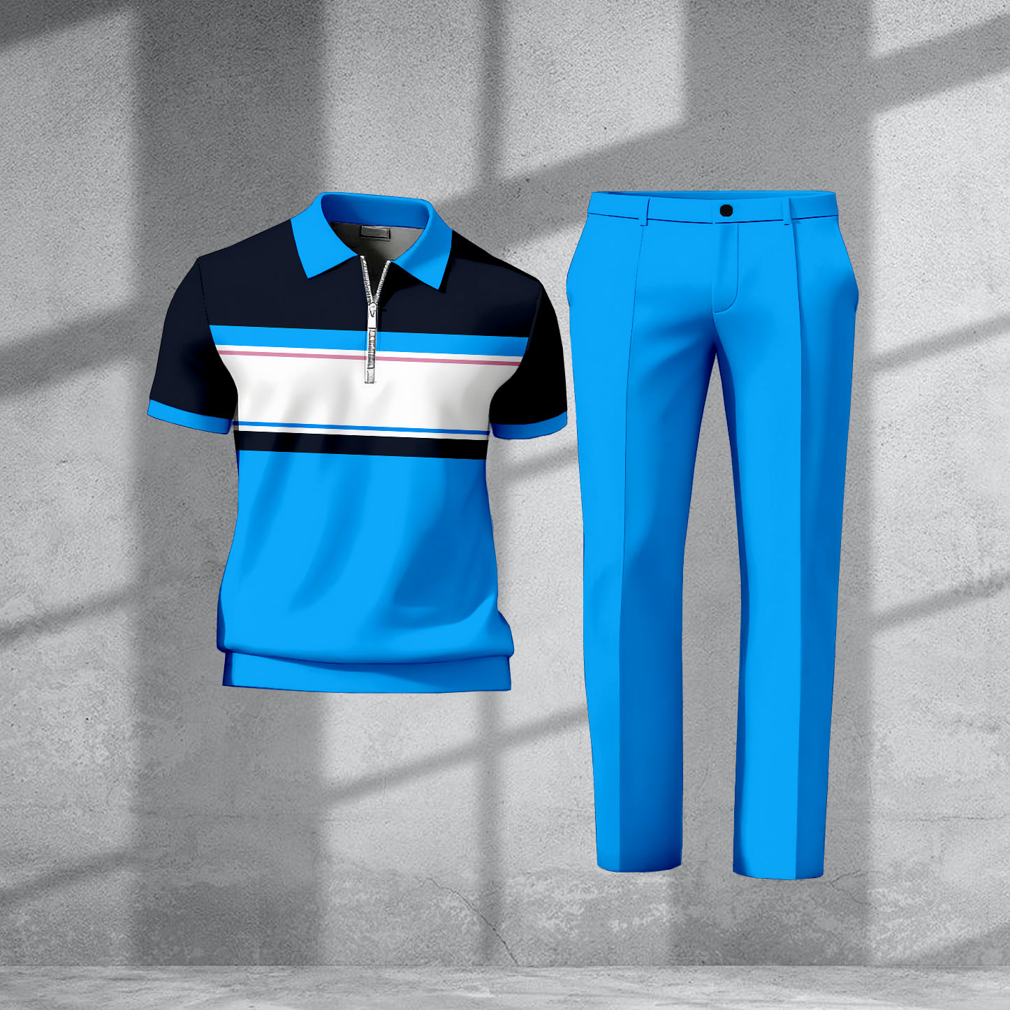 Men's Casual Black & Blue & White Color Matching Striped Printed Short Sleeved Zipper Polo Shirt & Trousers Two-Piece Set
