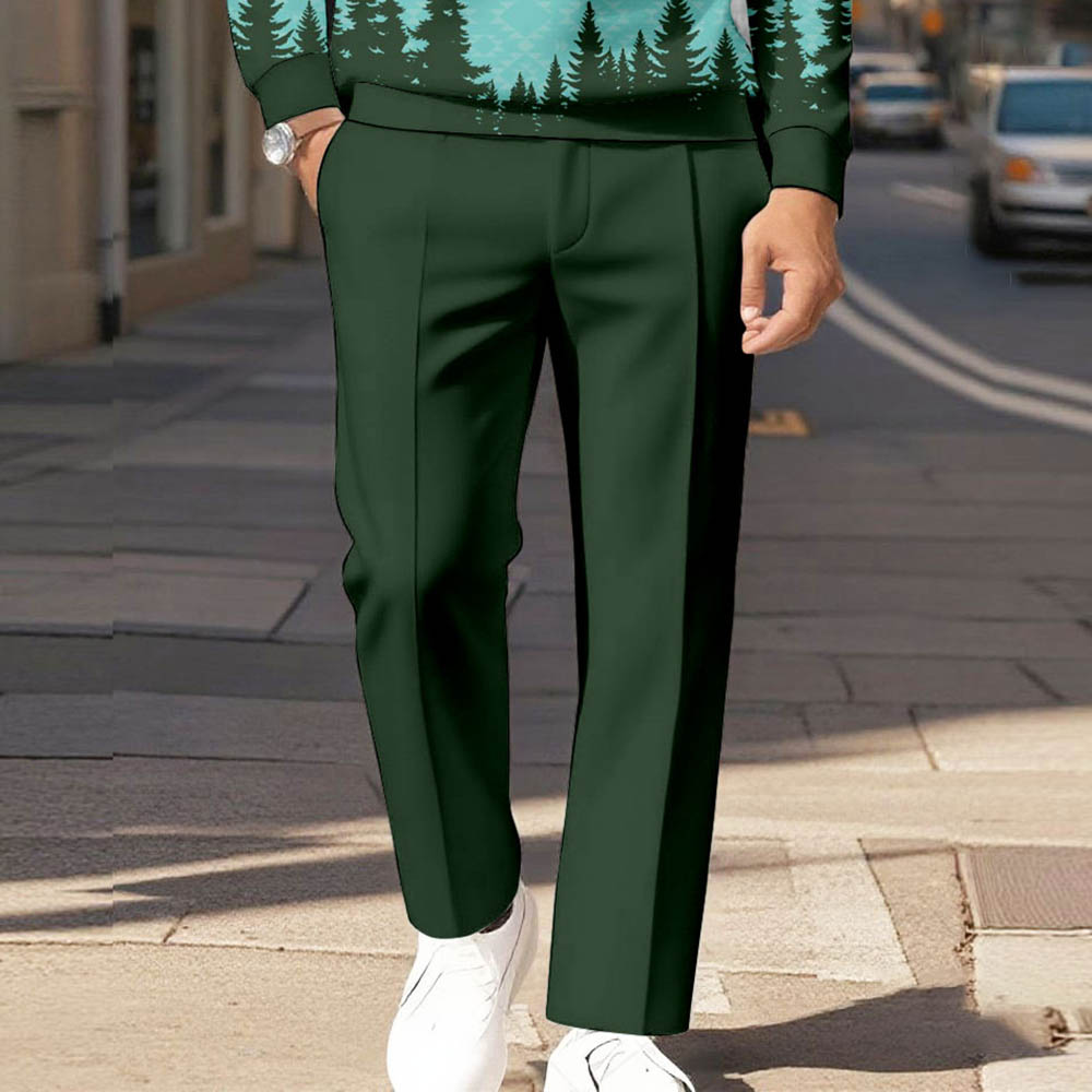 Men's Casual Blue & Green Color Matching Tree Printed Polo-Collar Zipper Long Sleeved Trousers Two-Piece Set