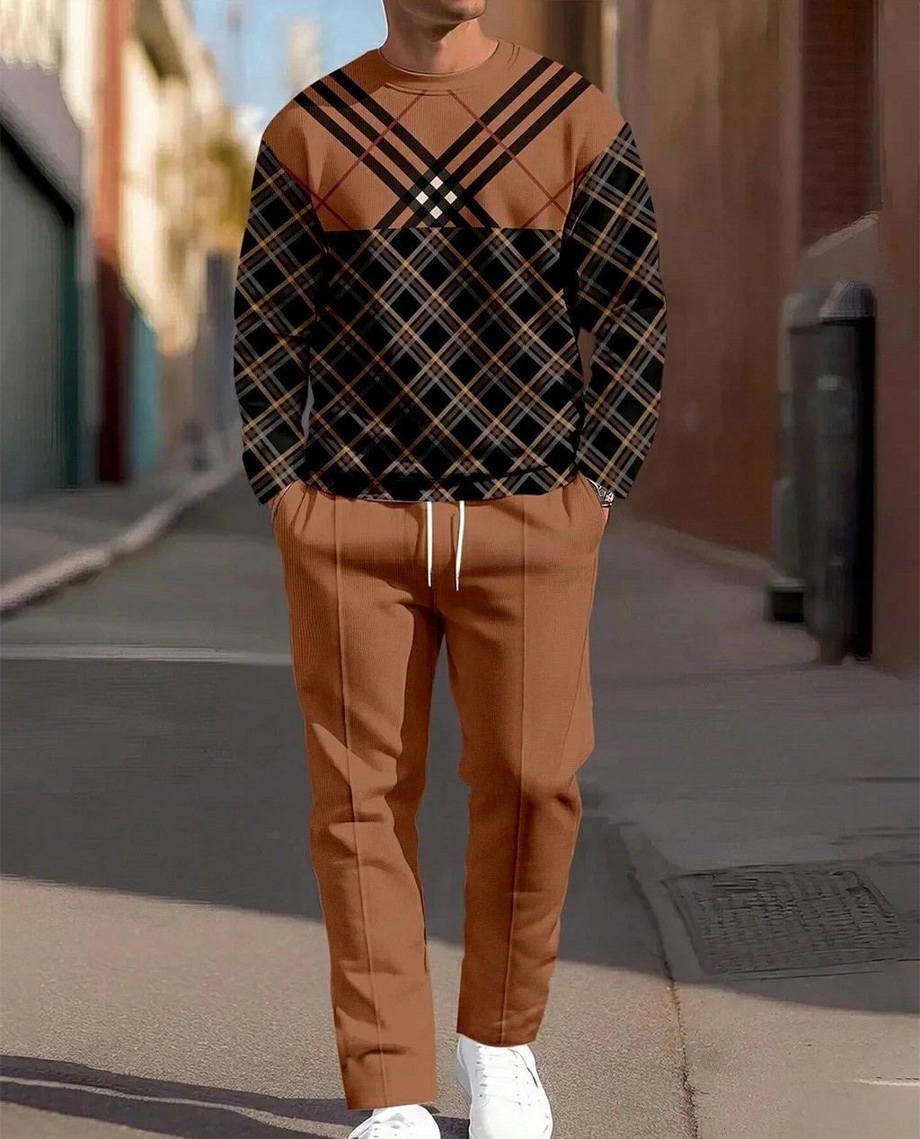 Men's Casual Brown & Black Color Matching Printed Round Neck Long Sleeved Trousers Brown Two-Piece Set