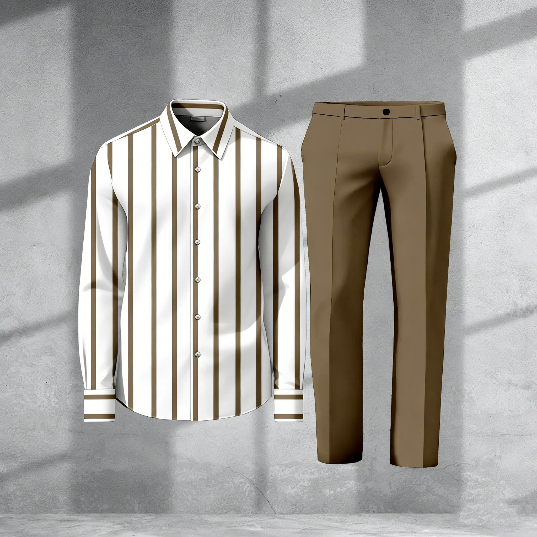 Men's Casual Coffee & White Color Matching Striped Printed Long Sleeved Shirt & Trousers Two-Piece Set