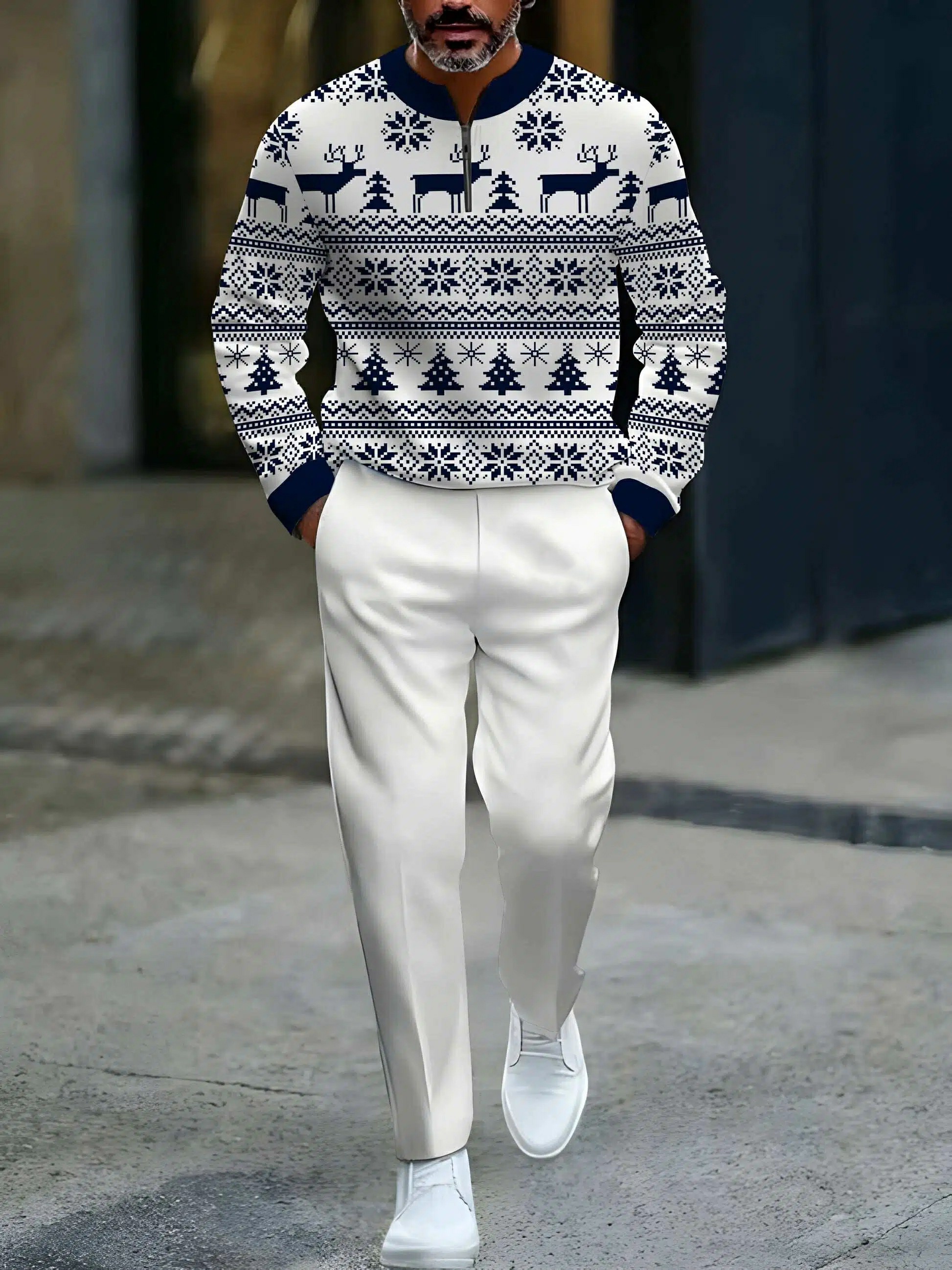 Men's Casual Navy & White Color Matching Christmas Printed Round-Neck Zipper Long Sleeved Sweatshirt & Trousers Two-Piece Set