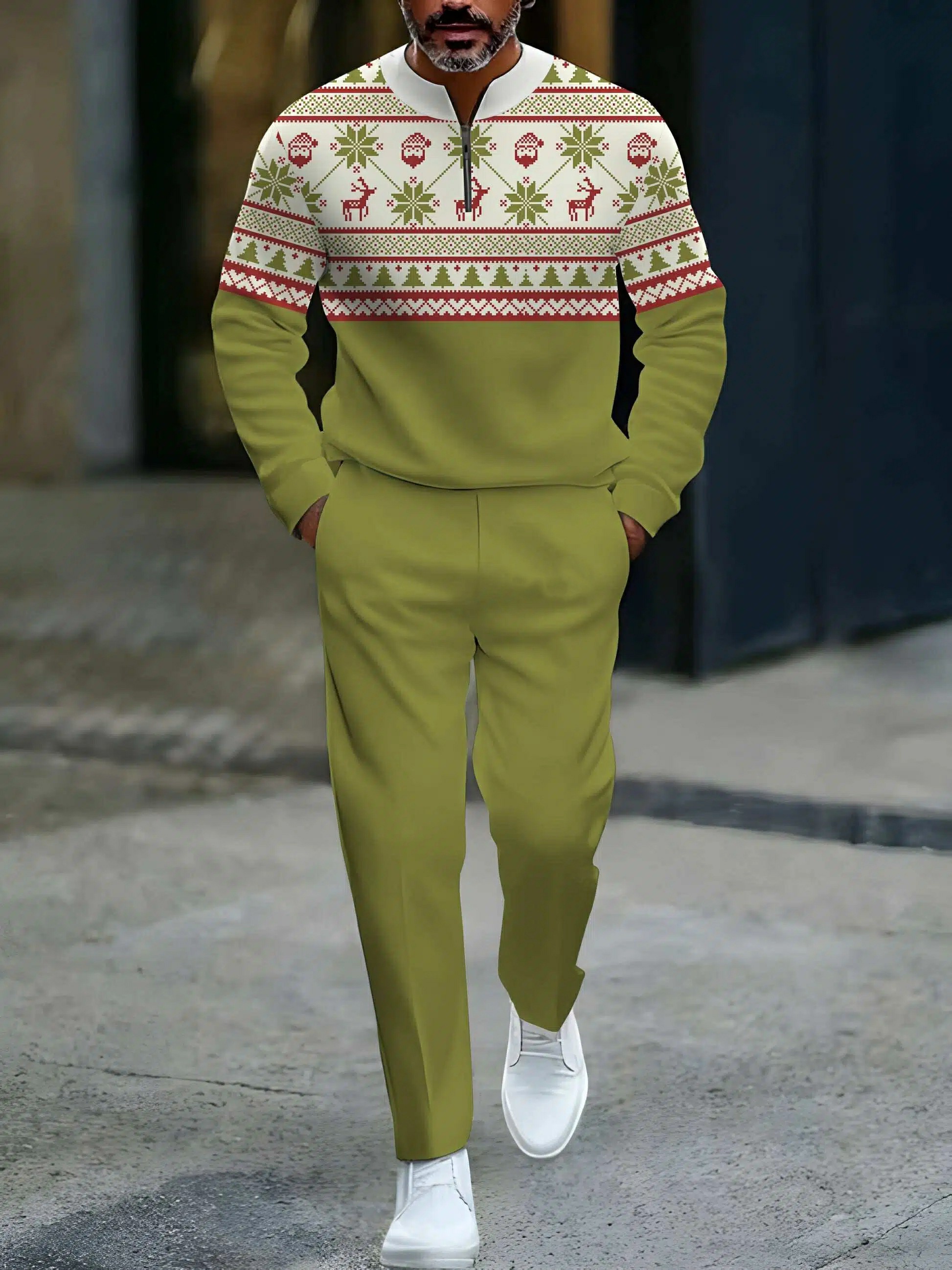 Men's Casual Green & Red Color Matching Christmas Printed Round-Neck Zipper Long Sleeved Sweatshirt & Trousers Two-Piece Set