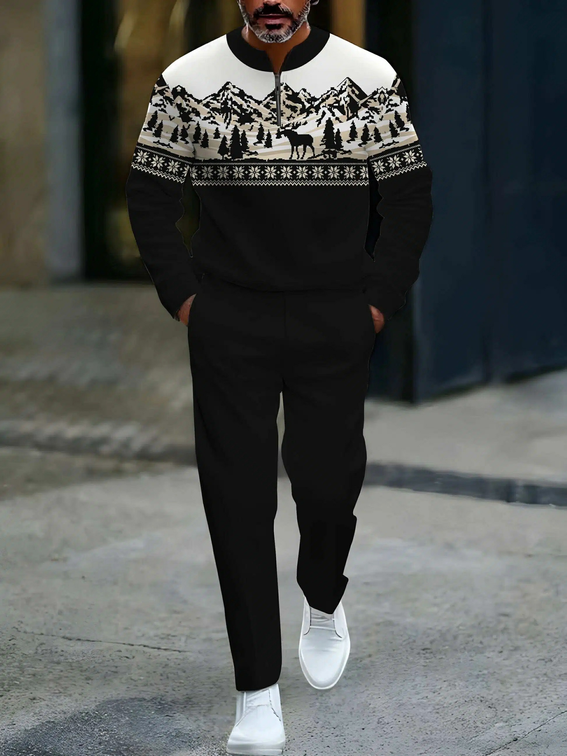Men's Casual Black & White Color Matching Elk Christmas Printed Round-Neck Zipper Long Sleeved Sweatshirt & Trousers Two-Piece Set