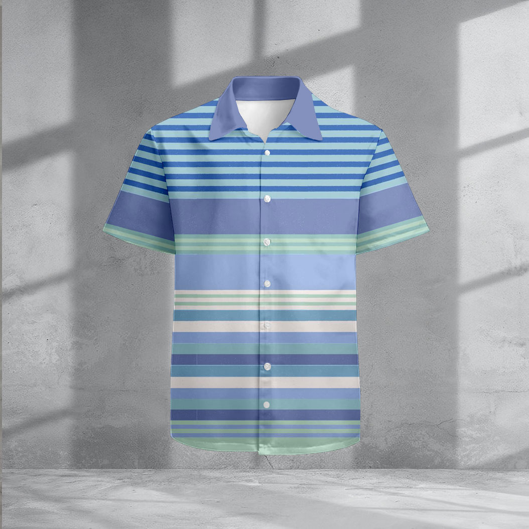 Men's Casual Blue & White Color Matching Striped Print Short-Sleeve Shirt