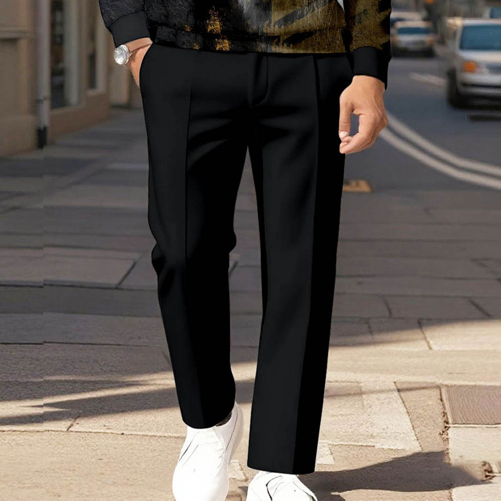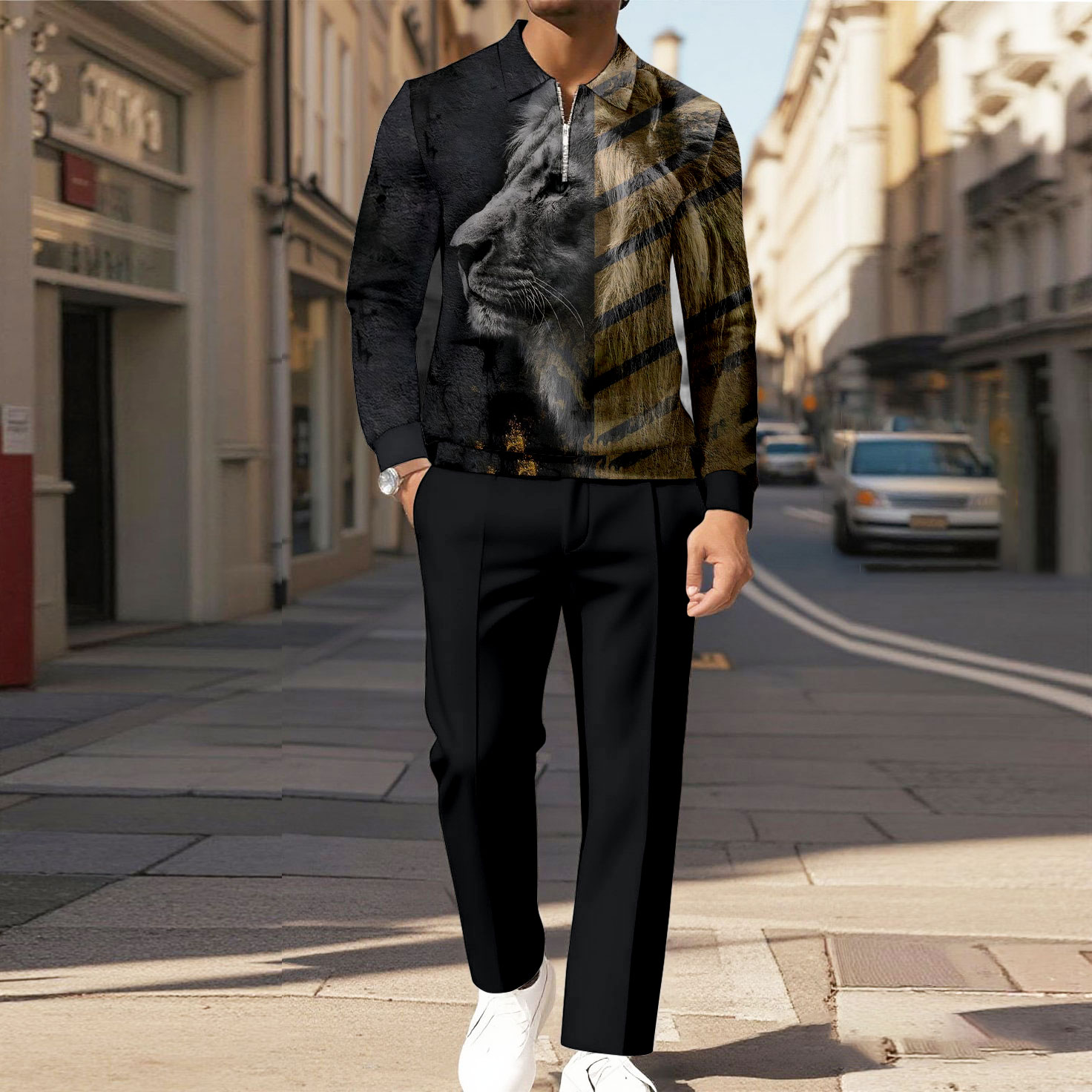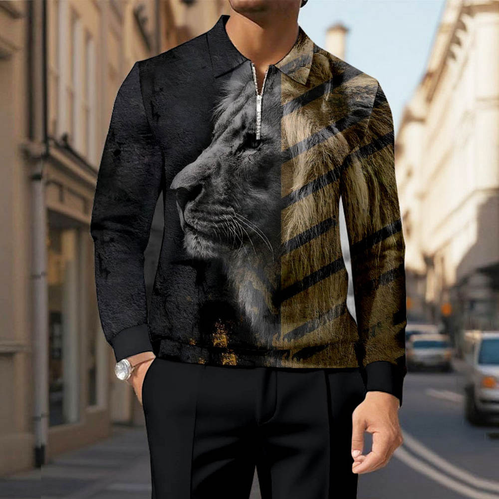 Men's Casual Color Matching Lion Printed Polo-Collar Zipper Long Sleeved Trousers Black Two-Piece Set