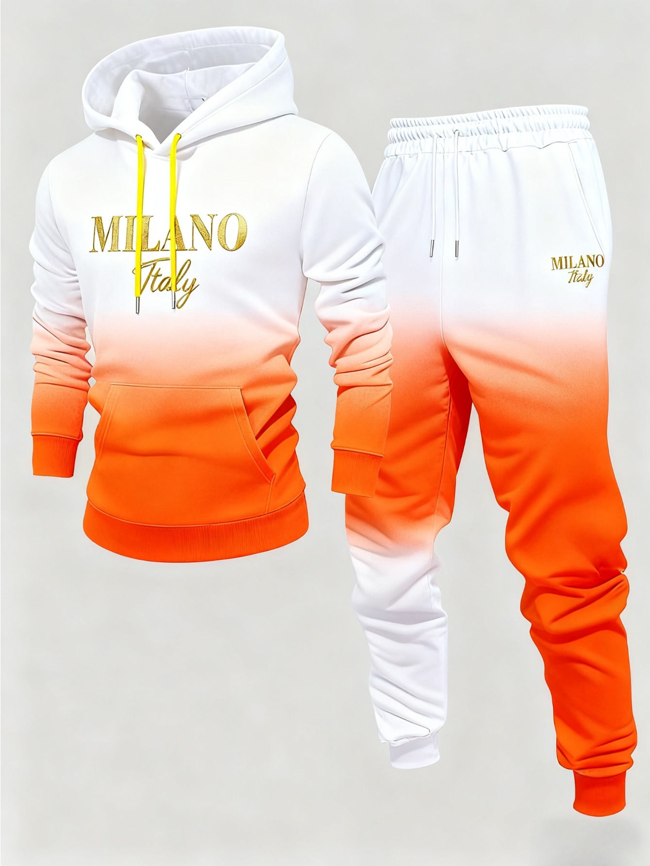Men's Casual Orange & White Gradient Color Matching Printed Hoodies Long Sleeved Sweatshirts & Sweatpants Two-Piece Set