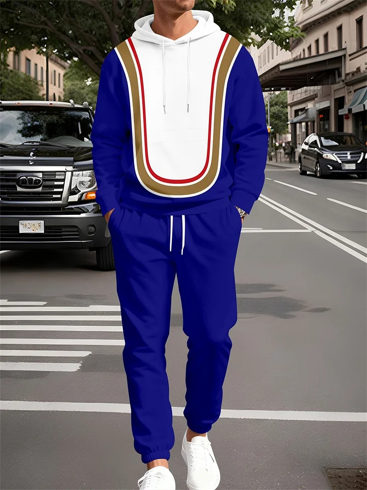 Men's Casual Color Matching Printed Hoodies Long Sleeved Trousers Royal Blue Two-Piece Set
