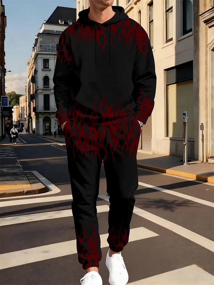 Men's Casual Color Matching Red Flame Patter Hoodies Long Sleeved Trousers Two-Piece Set