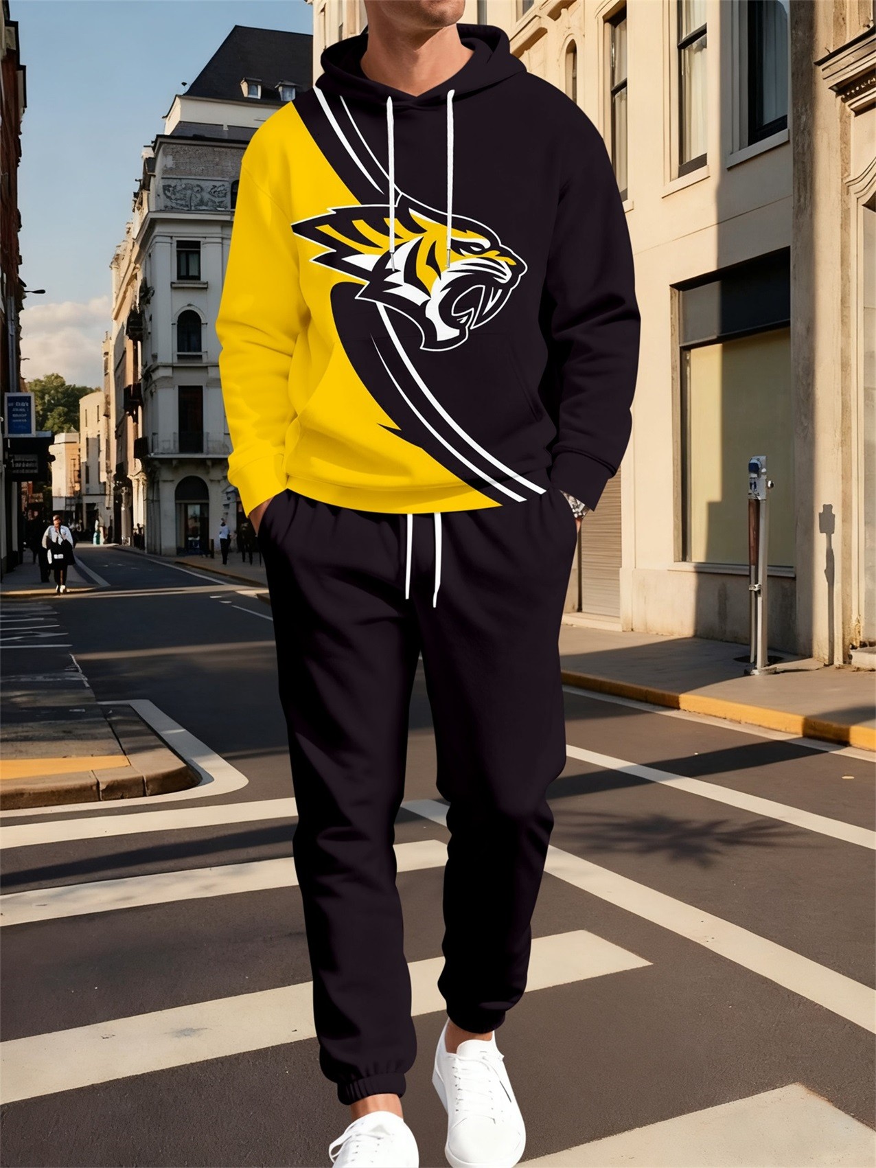 Men's Casual Tiger Black&Yellow Color Matching Printed Hoodies Long Sleeved Trousers Two-Piece Set