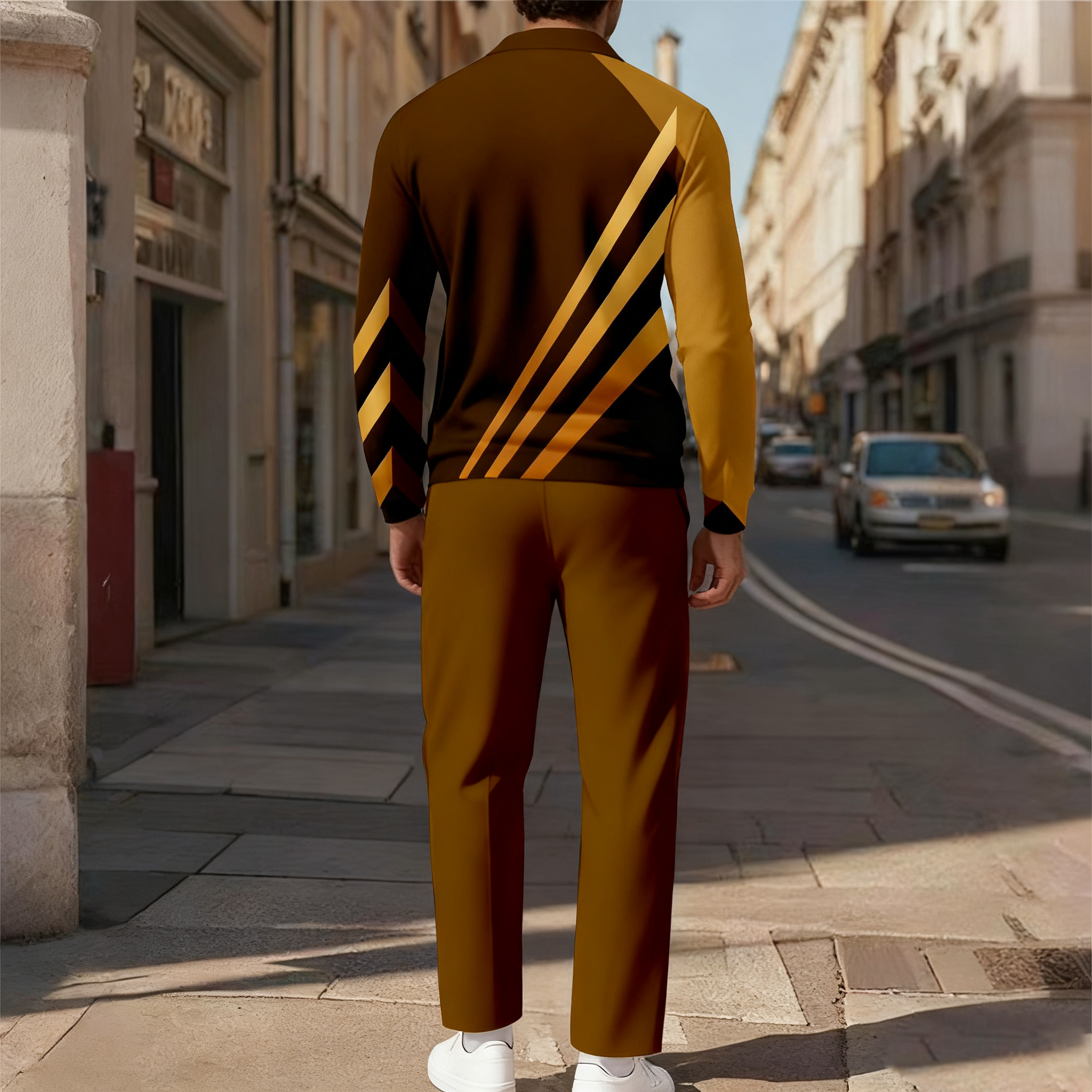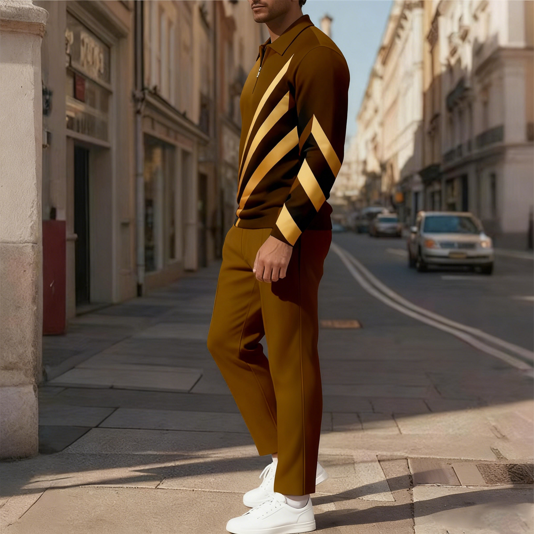 Men's Casual Color Matching Printed Polo-Collar Zipper Long Sleeved Trousers Two-Piece Set