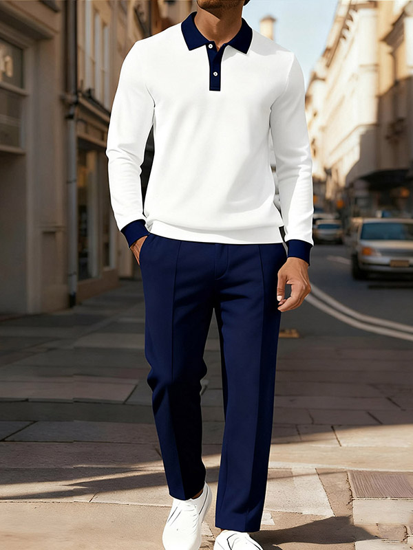 Men's Casual Color White&Navy Matching Printed Polo-Collar Long Sleeved Trousers Two-Piece Set