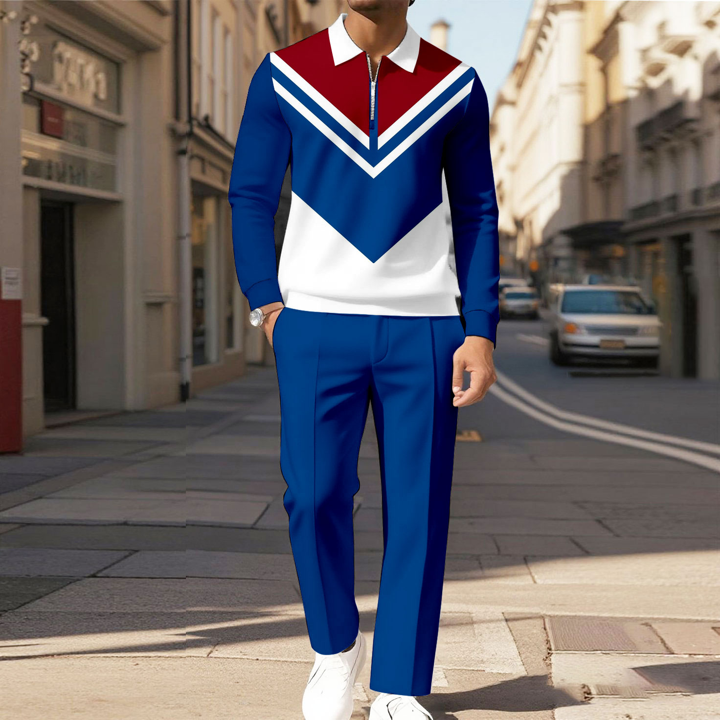 Men's Casual Color Matching Printed Polo-Collar Zipper Long Sleeved Trousers Two-Piece Set