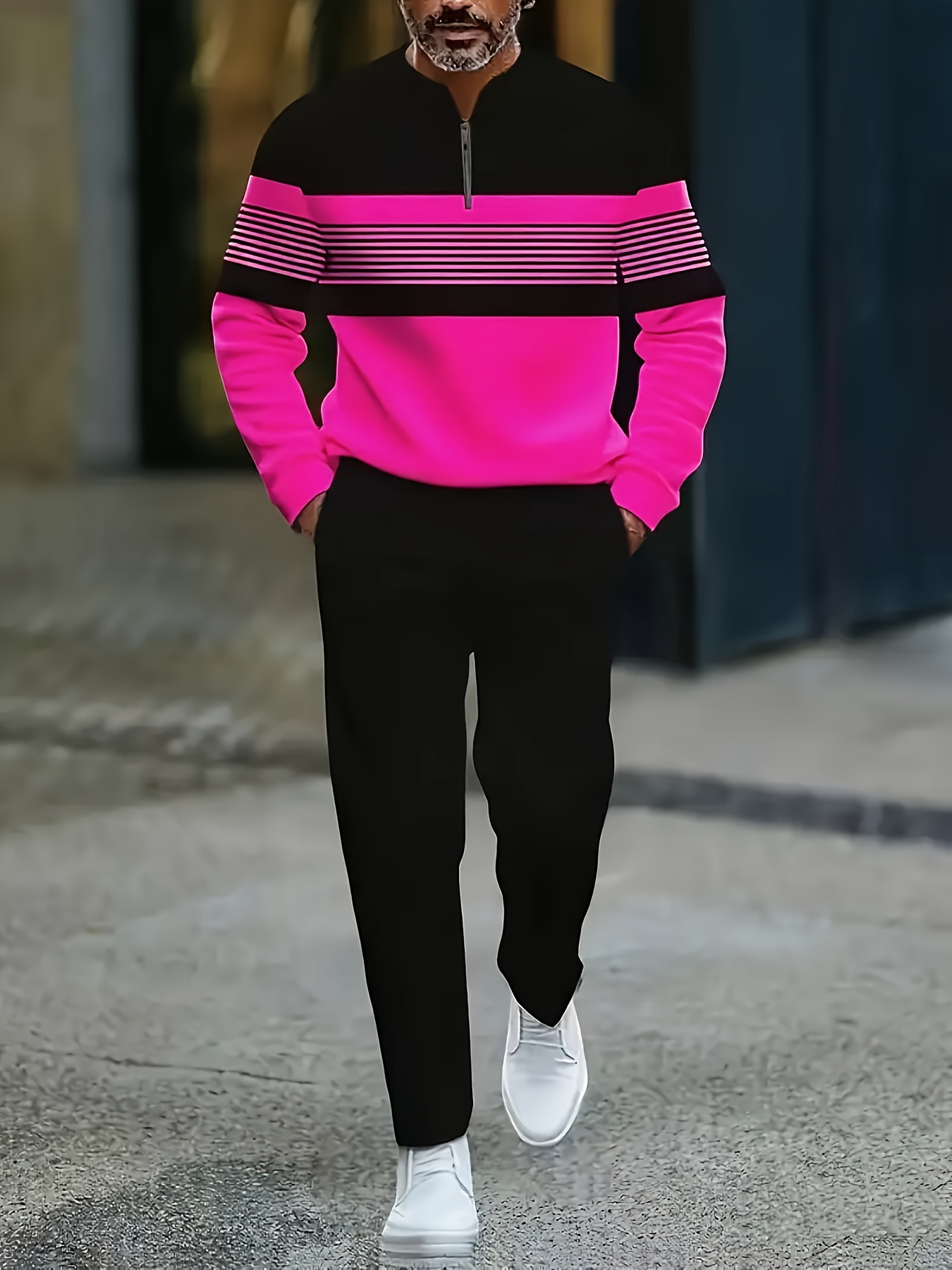 Men's Casual Color Matching Printed Round-Neck Zipper Long Sleeved Trousers Two-Piece Set
