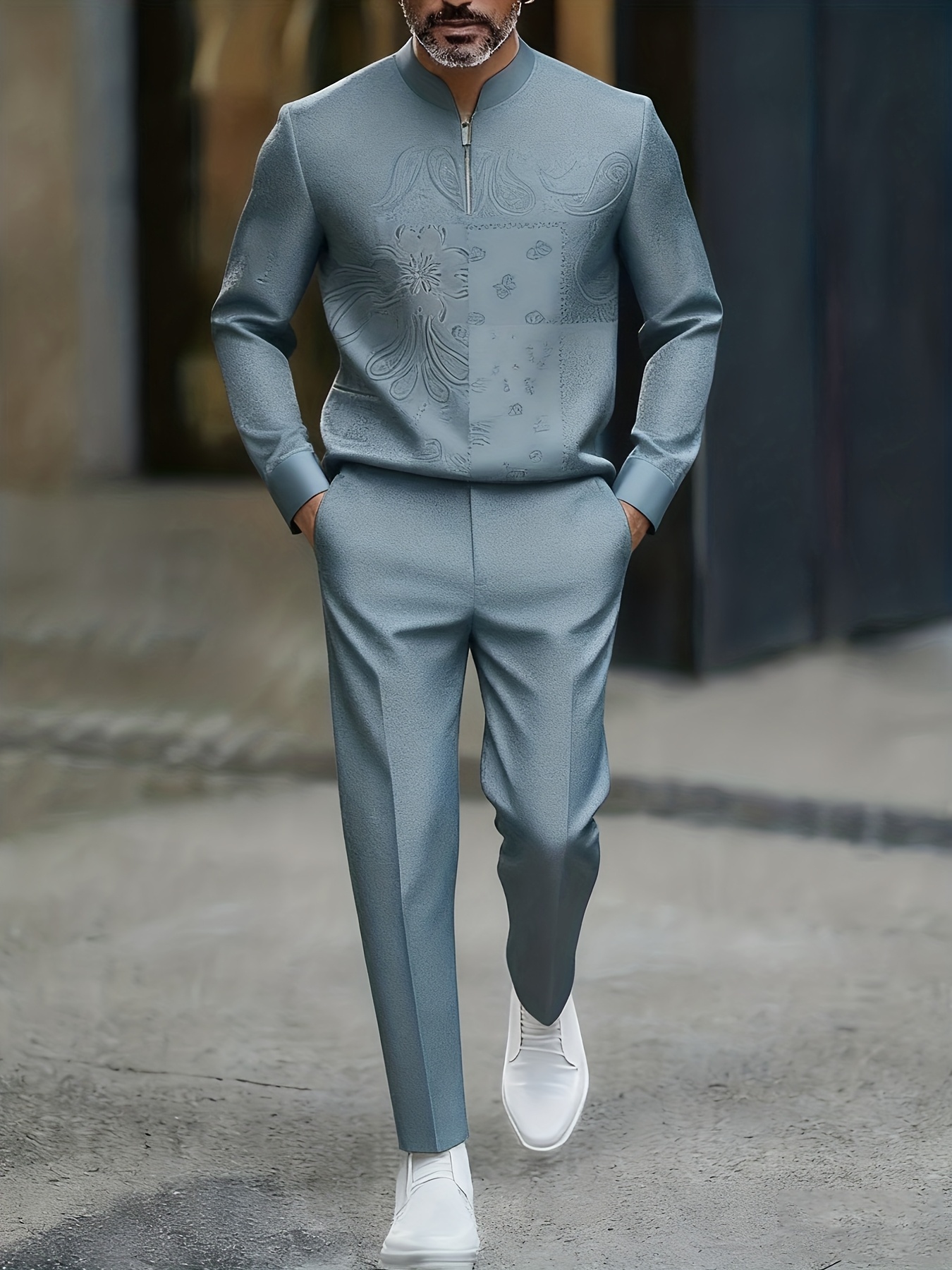 Men's Casual Color Matching Printed Round-Neck Zipper Long Sleeved Trousers Two-Piece Set