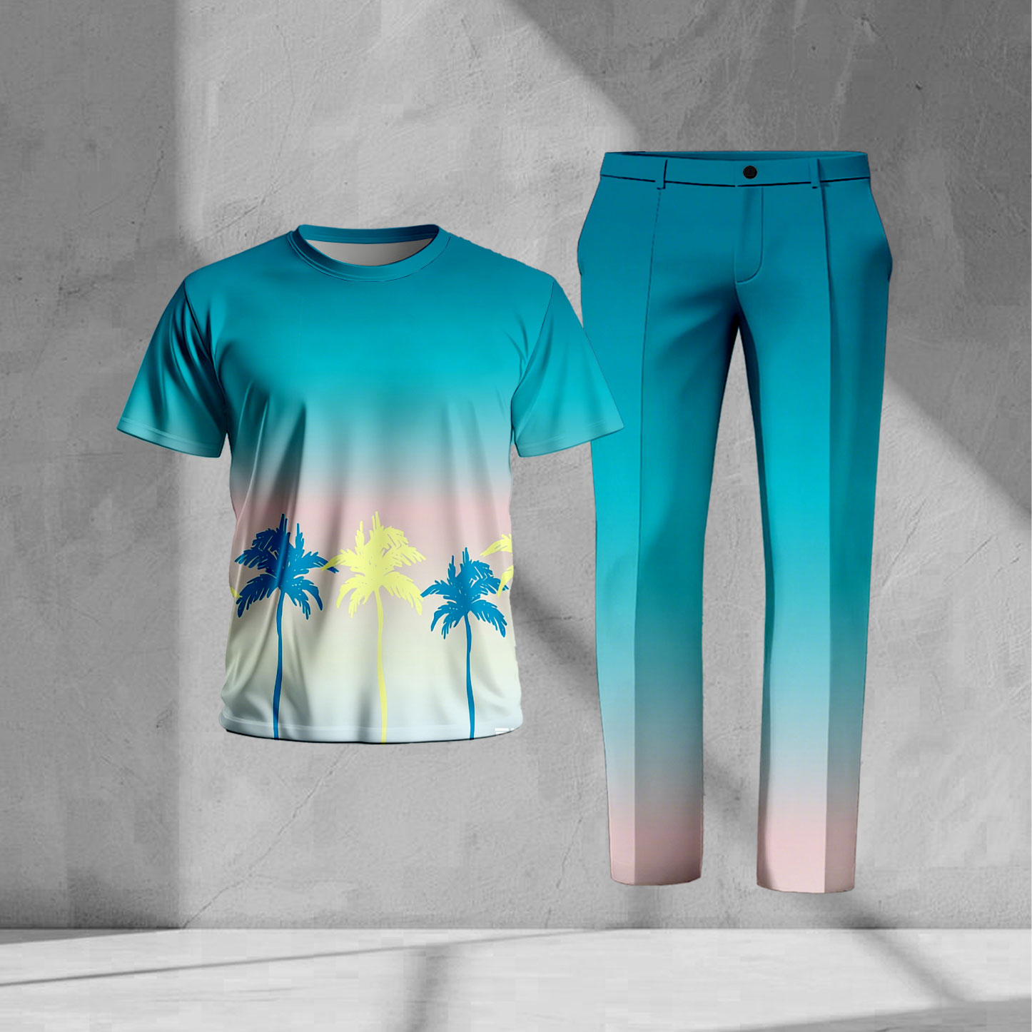 Men's Casual Gradient Blue Color Matching Trees Printed Short Sleeved T-Shirt & Trousers Two-Piece Set