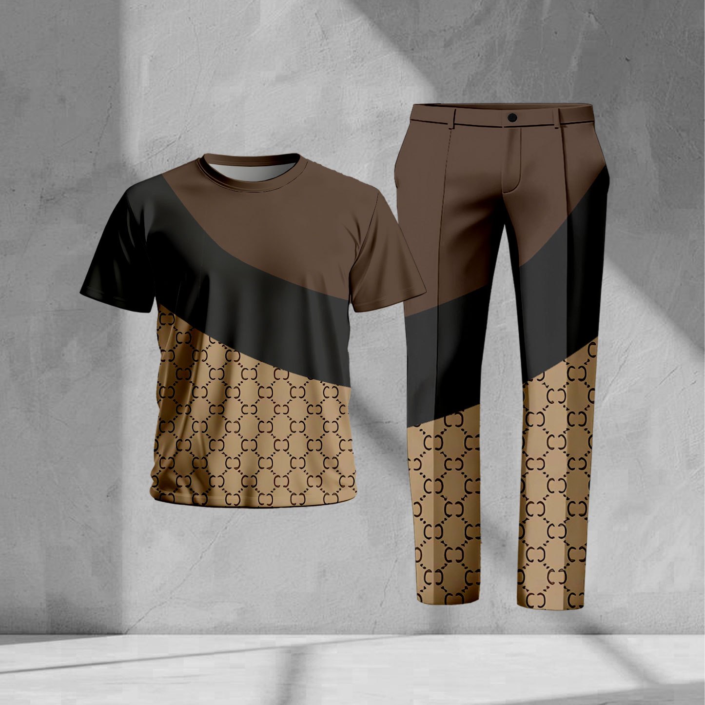 Men's Casual Tan & Coffee Color Matching Vintage Printed Short Sleeved T-Shirt & Trousers Two-Piece Set