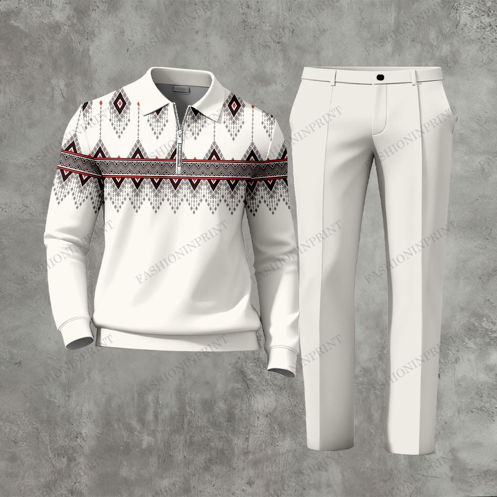 Men's Casual Beige Color Matching Ethnic Printed Zipper Long Sleeved Polo Shirt & Trousers Two-Piece Set