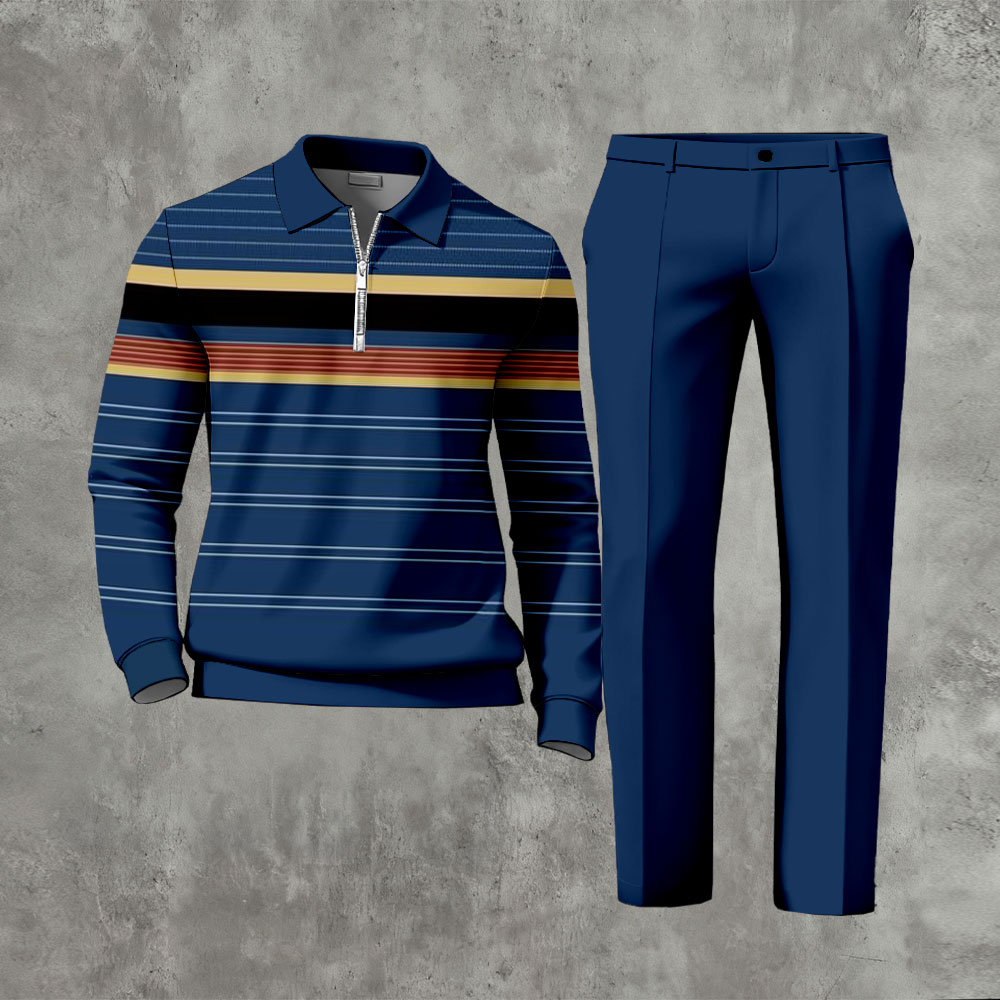 Men's Casual Navy Blue & Multi Color Matching Striped Printed Zipper Long Sleeved Polo Shirt & Trousers Two-Piece Set