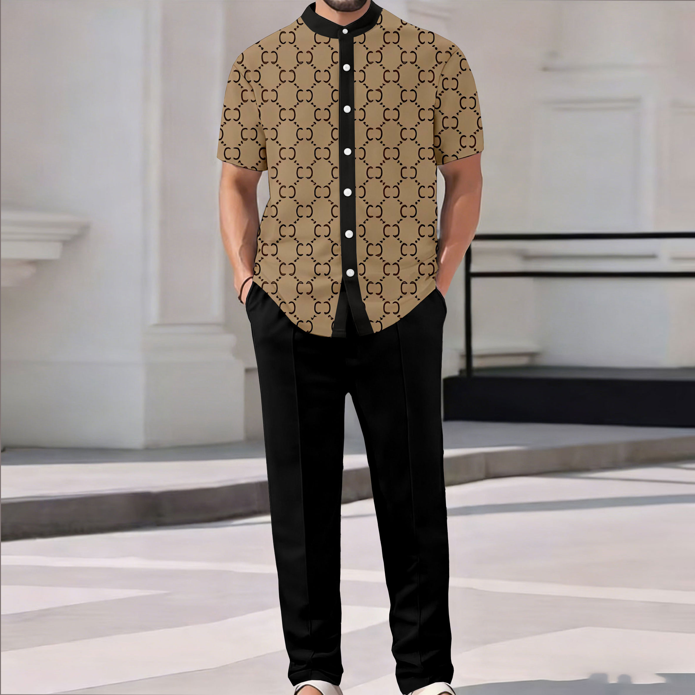 Men's Casual Coffee & Black Color Matching Vintage Printed Short Sleeved Shirt & Trousers Two-Piece Set
