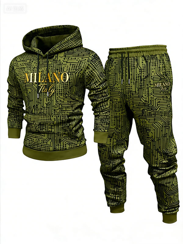 Men's Casual Green & Black Color Polka Dots Printed Hoodies Long Sleeved Sweatshirts & Sweatpants Two-Piece Set