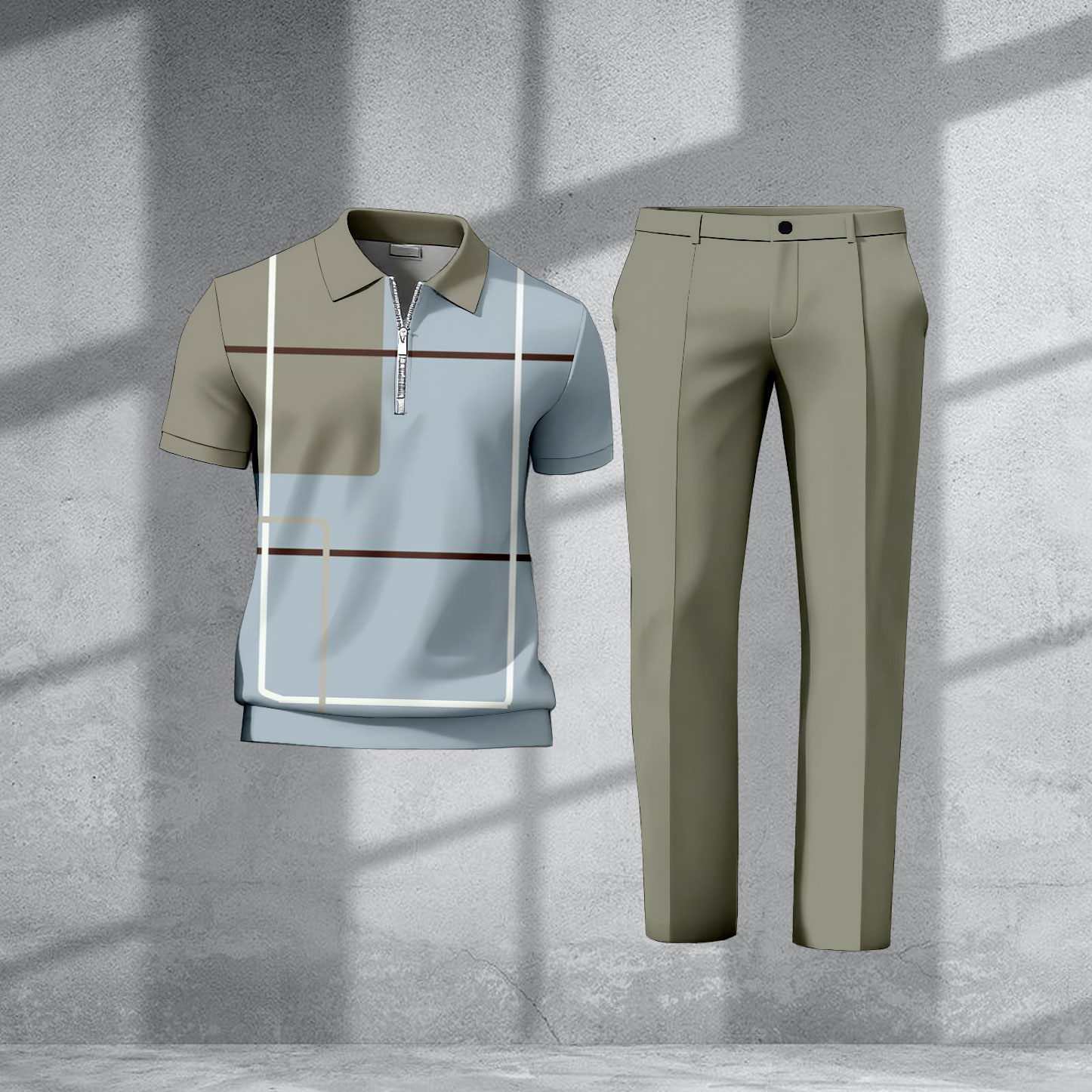 Men's Casual Green & Blue Color Matching Geometric Printed Short Sleeved Zipper Polo Shirt & Trousers Two-Piece Set