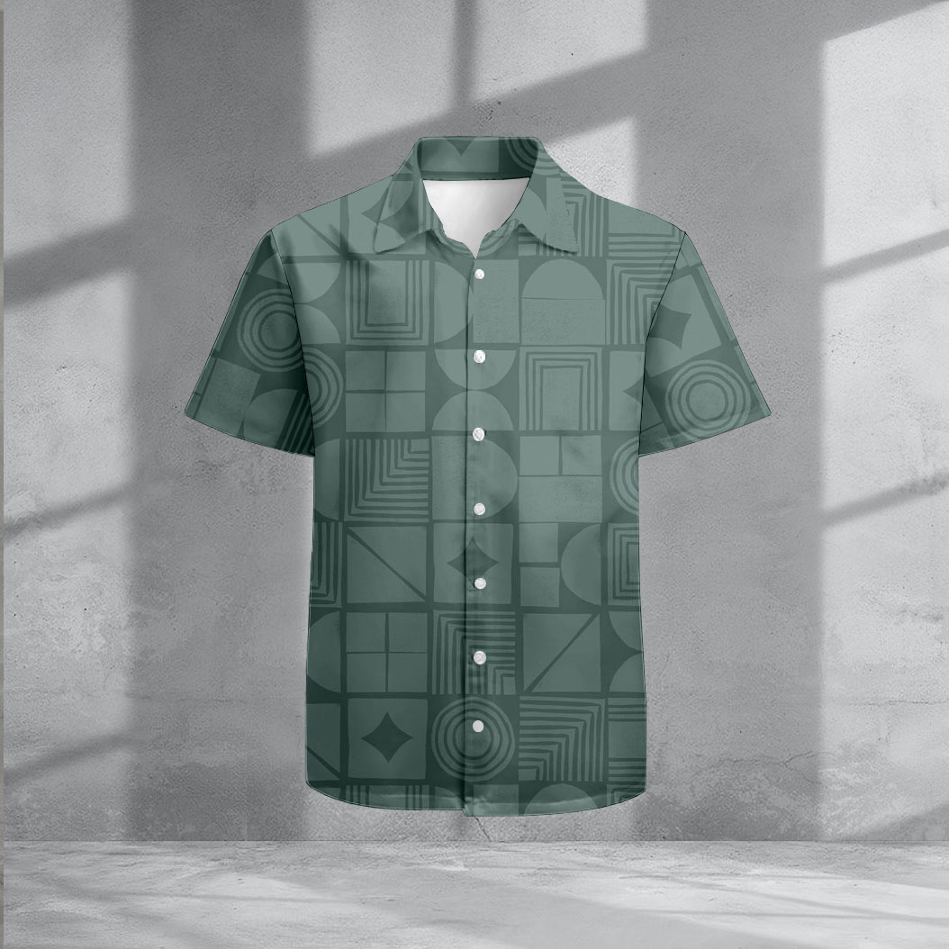 Men's Casual Green Color Matching Geometric Print Short-Sleeve Shirt
