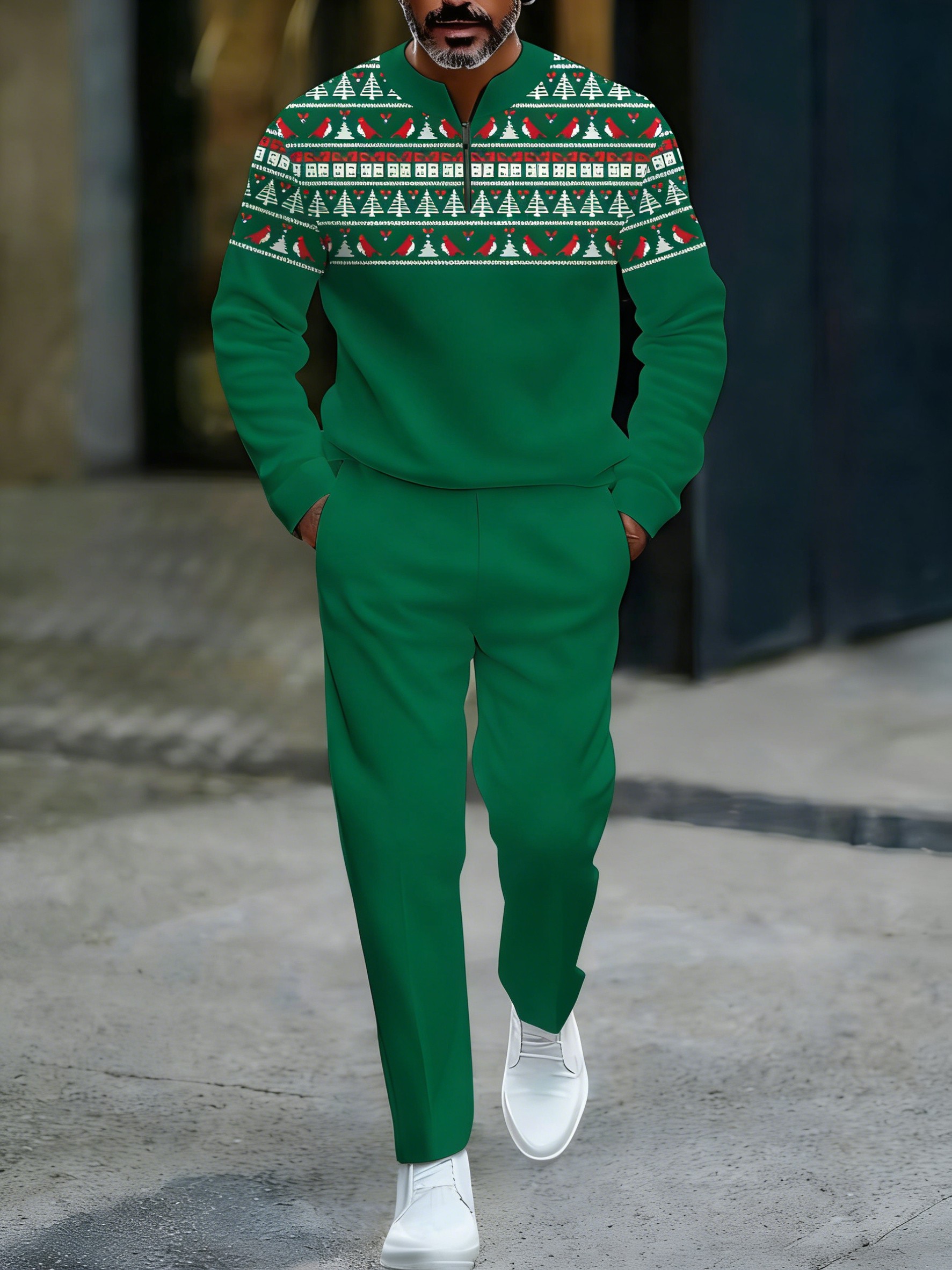 Men's Casual Green & White Color Matching Christmas Printed Round-Neck Zipper Long Sleeved Sweatshirt & Trousers Two-Piece Set
