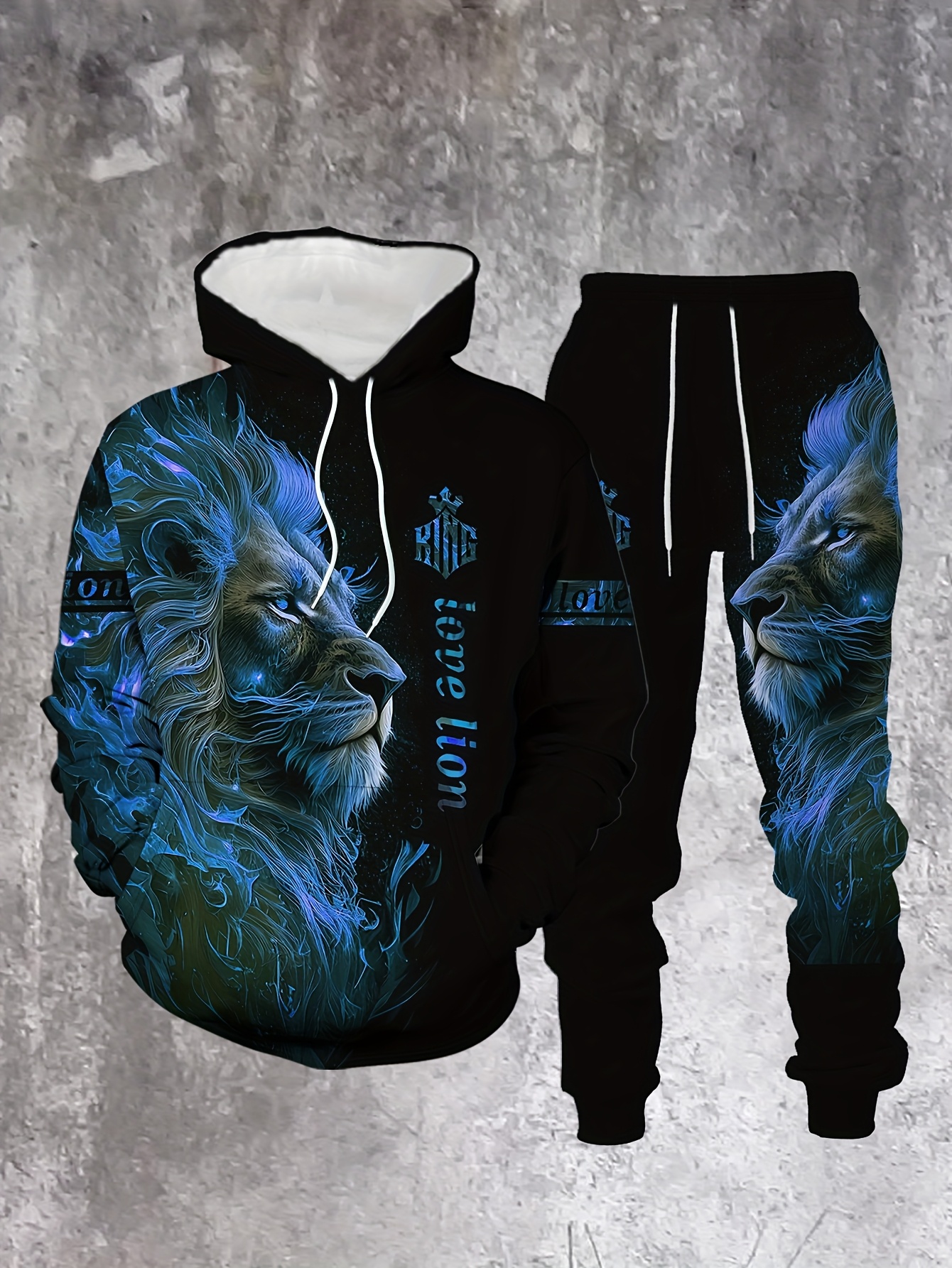 Men's Casual "Love Lion" Printed Hoodies Long Sleeved Sweatshirts & Sweatpants Two-Piece Set