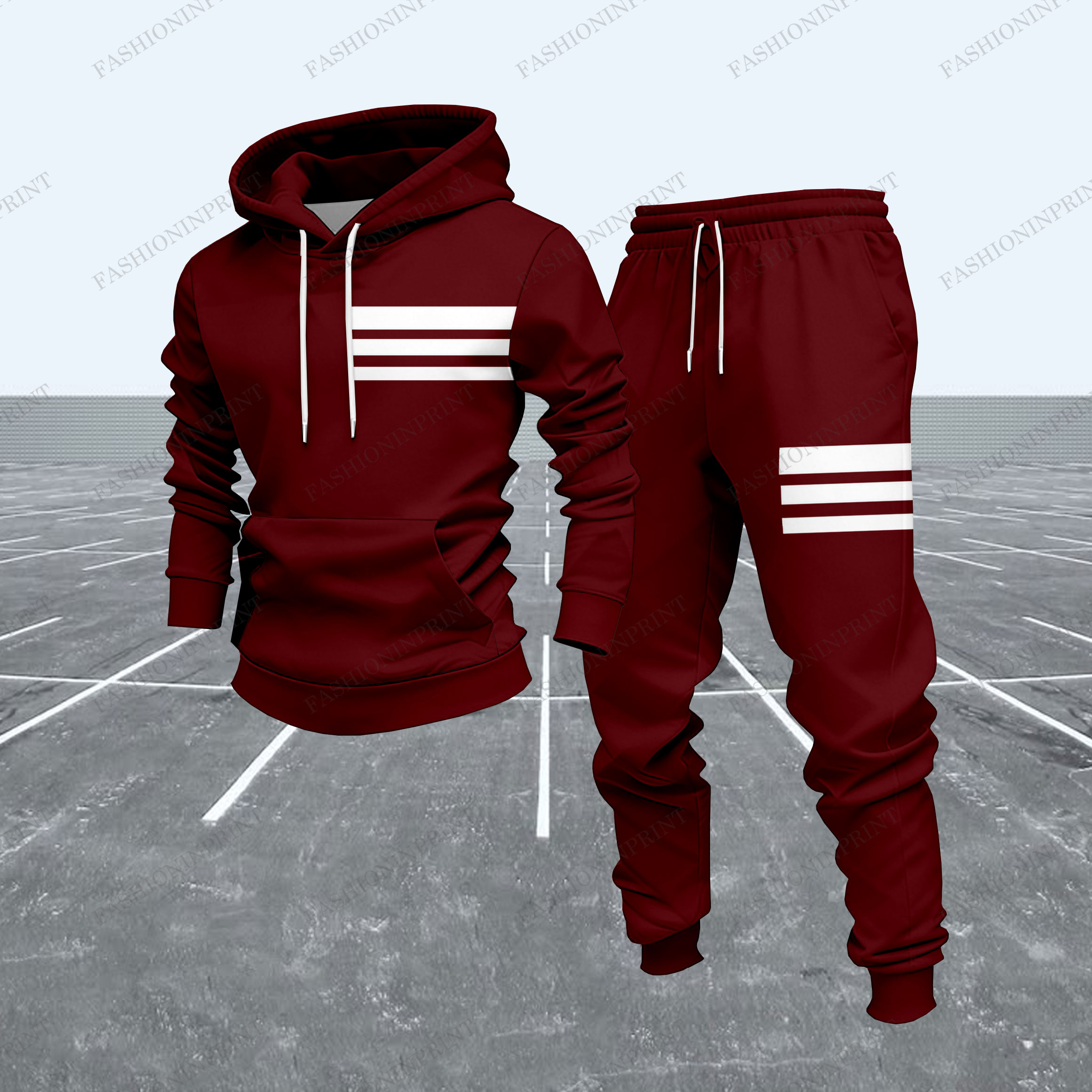 Men's Casual Maroon & White Geometric Pattern Hoodies Long Sleeved Sweatshirts & Sweatpants Two-Piece Set