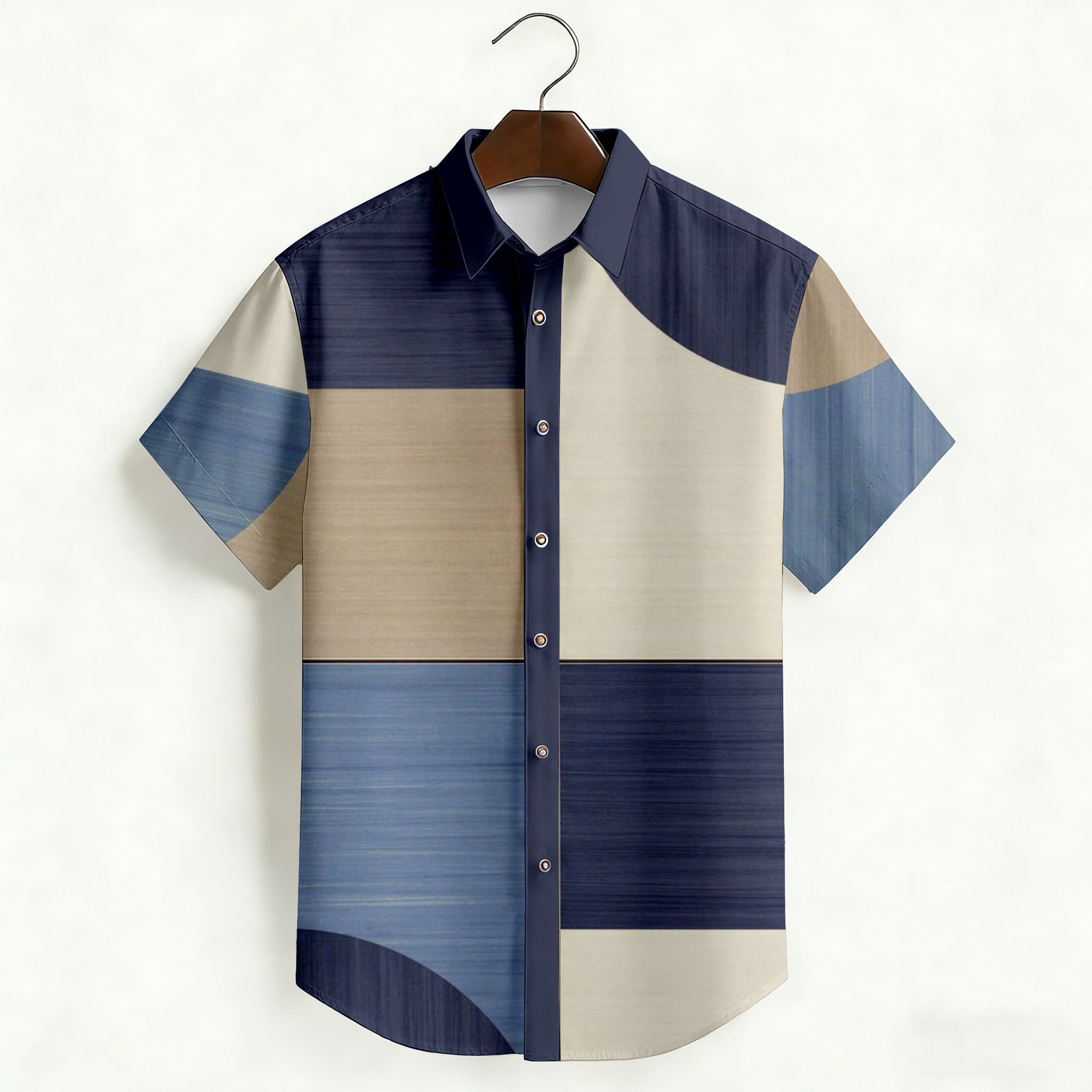 Men's Casual Navy Blue & Beige Color Matching Geometric Print Short-Sleeve Shirt