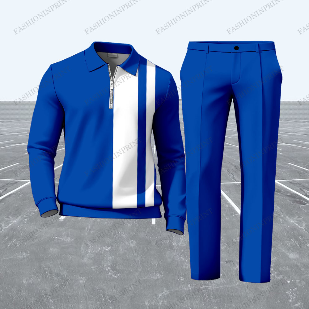 Men's Casual Royal Blue & White Color Matching Striped Printed Zipper Long Sleeved Polo Shirt & Trousers Two-Piece Set