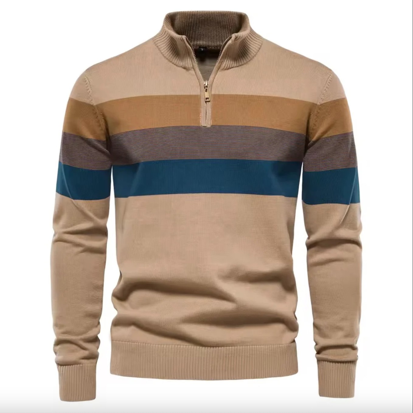 Men's Coffee Color Matching Striped Printed Long Sleeve Zipper Neck Sweater