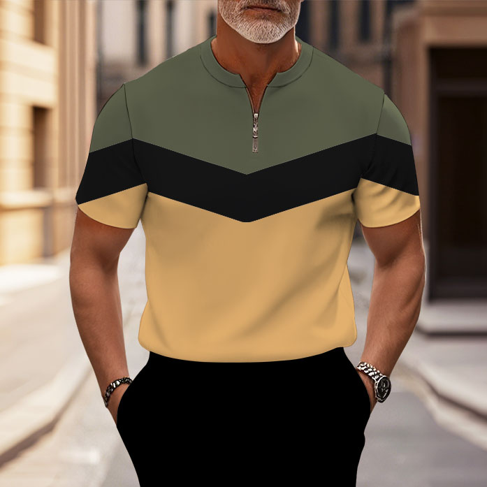 Men's Fashion Casual Round-Neck Zipper Geometric Printed Short-Sleeved T-Shirt