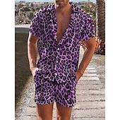 Men's Leopard 2pcs Shirts Sets Summer Hawaiian Shirt Short Sleeve Short Pants Turndown Tropical Fashion Hawaiian Casual Holiday Beach Print Summer Spring Blue Purple Brown