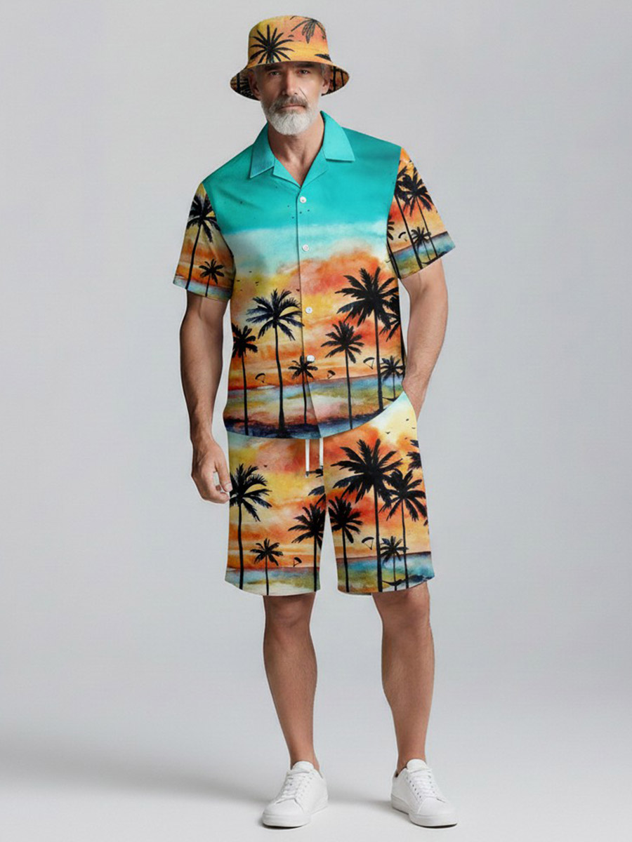 3Pcs Men's Lake Green Hawaii Style Printed Short Sleeves Shirt & Short & Fisherman's Hat