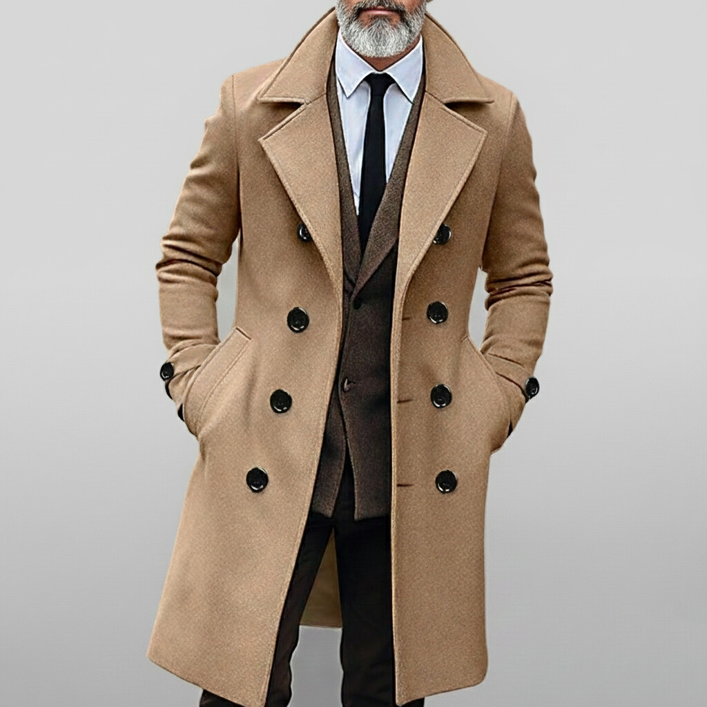 Men's Business Khaki Notched Lapel Double Breasted Slant Pocket Long Sleeve Mid-Length Trench Coats