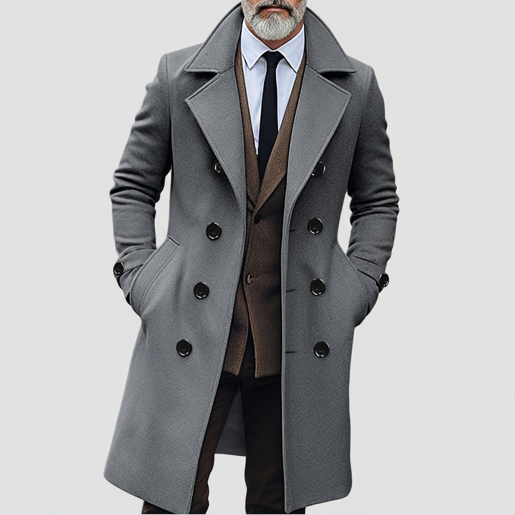 Details: Double Breasted, Slant Pocket, Long Sleeve, Mid-Length