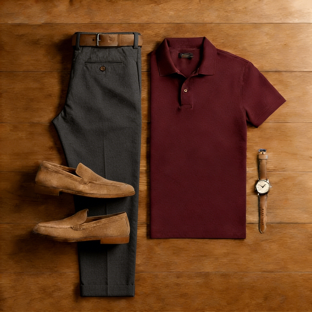 Men's Casual Burgundy & Dark Gray Solid Color Matching Short Sleeved Polo Shirt & Trousers Two-Piece Set