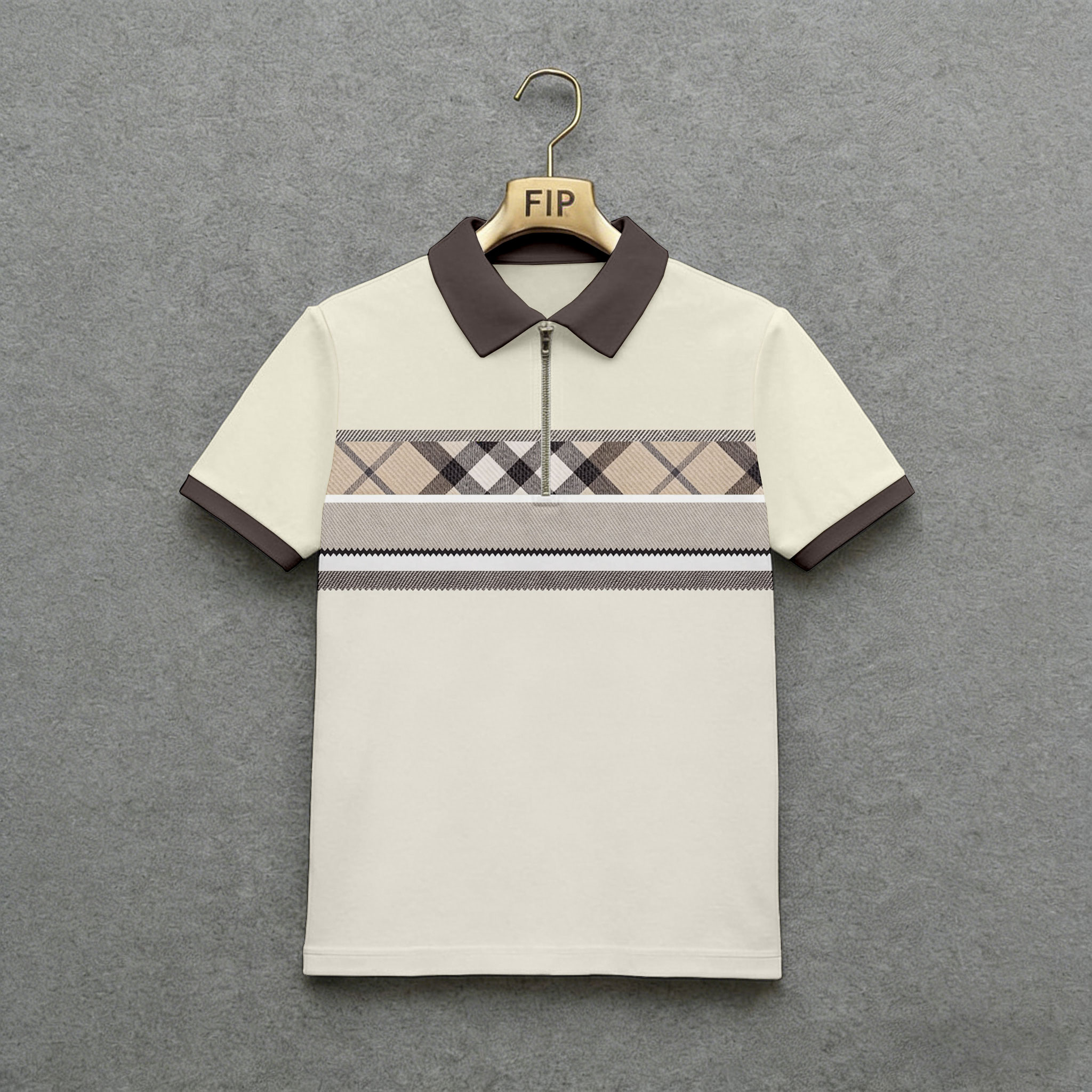 Men's Casual Beige & Khaki Color Matching Checkered Patchwork Print Short-Sleeve Polo Shirt