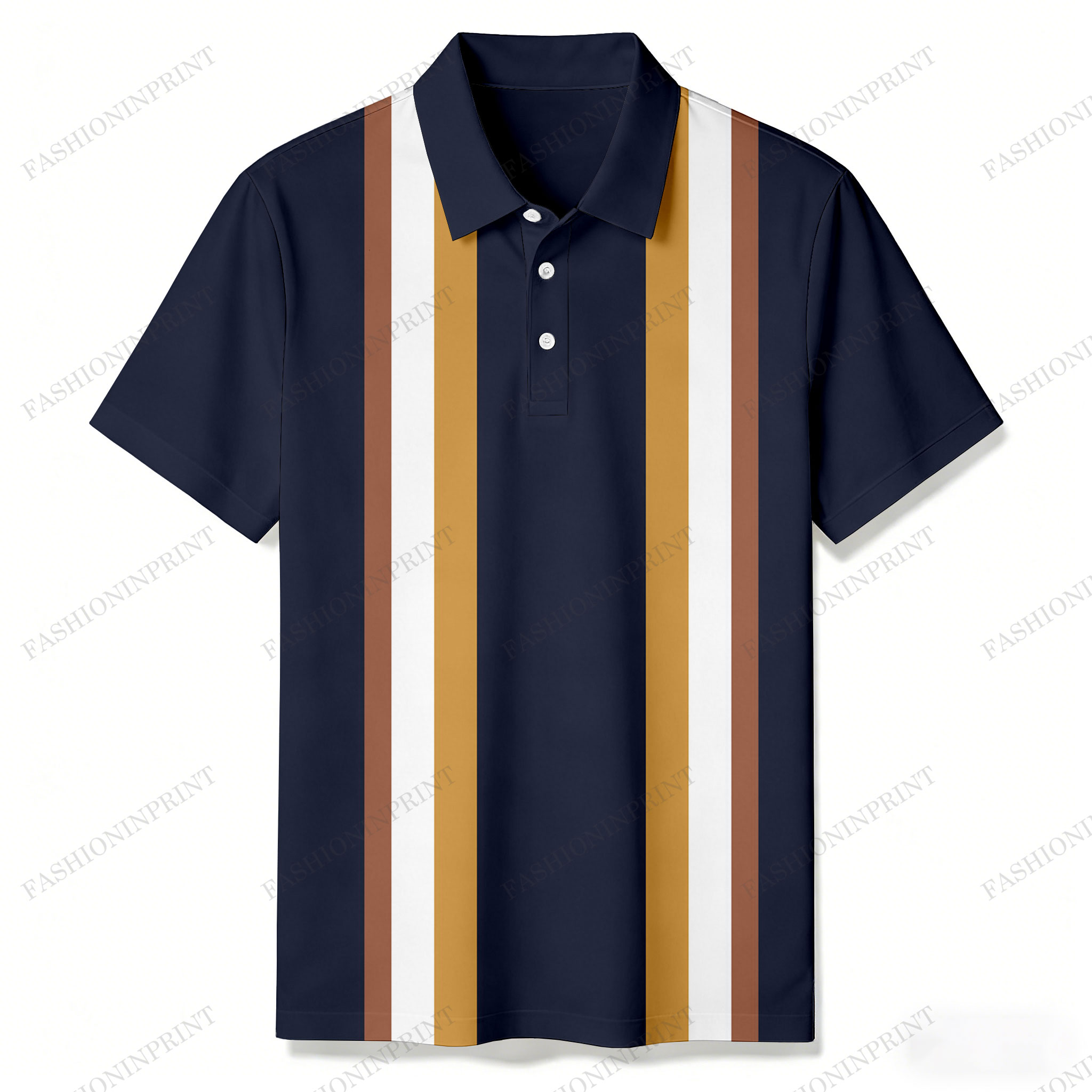 Men's Casual Navy Blue & Yellow Color Matching Striped Printed Short Sleeved Polo Shirt