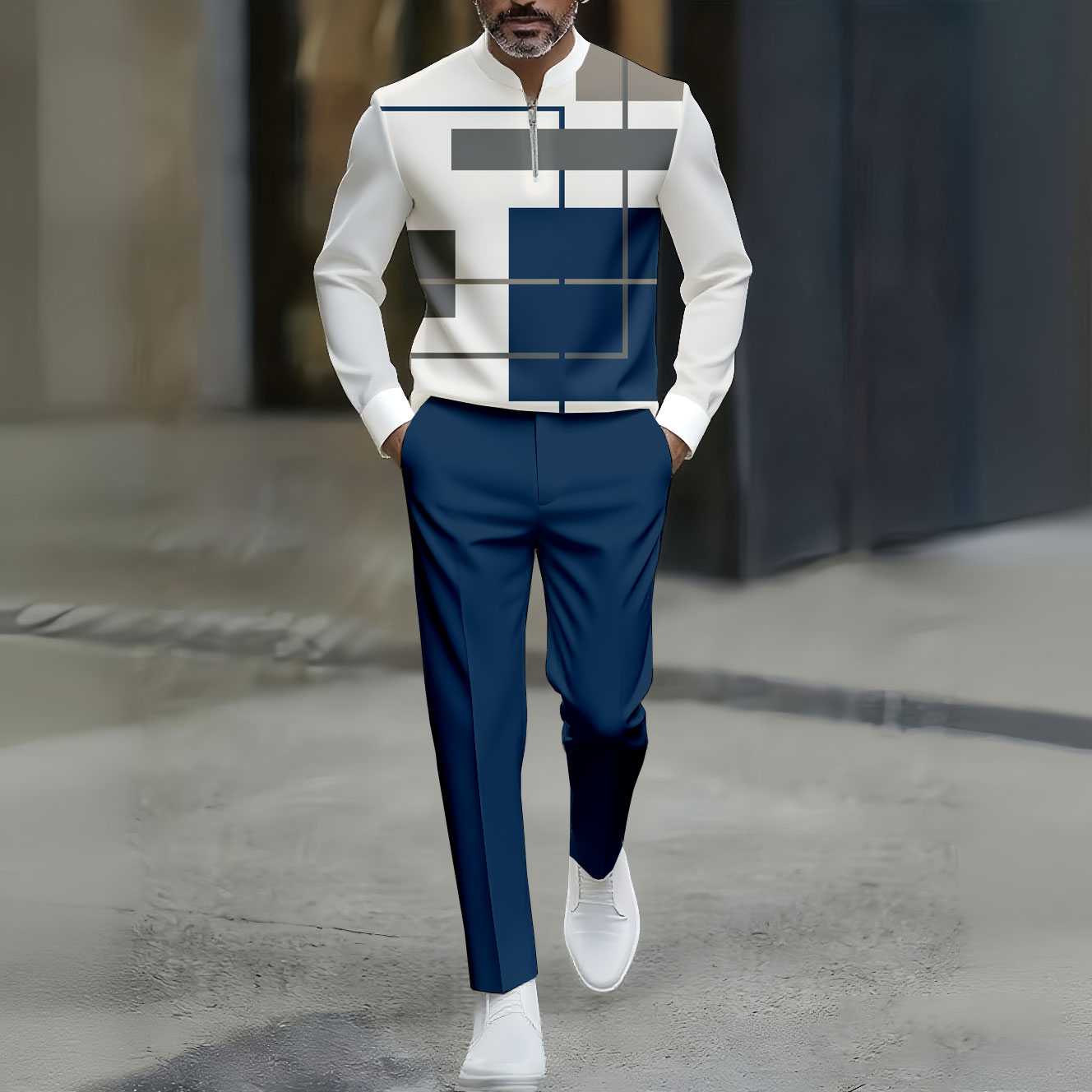 Men's Casual Geometric Print Polo Collar Zipper Long Sleeve Pants Two-Piece Set