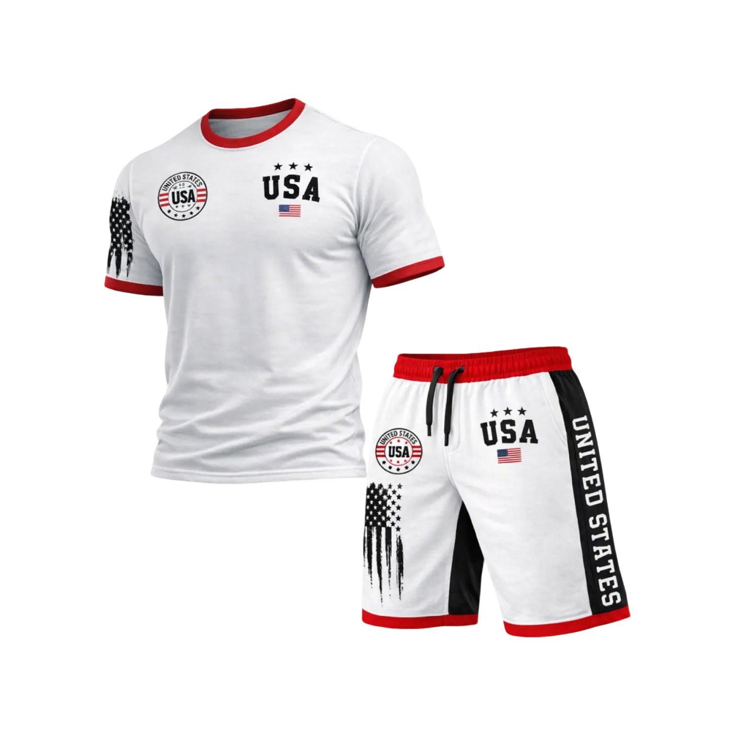 Men's Casual Navy Blue USA Printed Short Sleeved Polo T-Shirt & Shorts White Two Piece Set