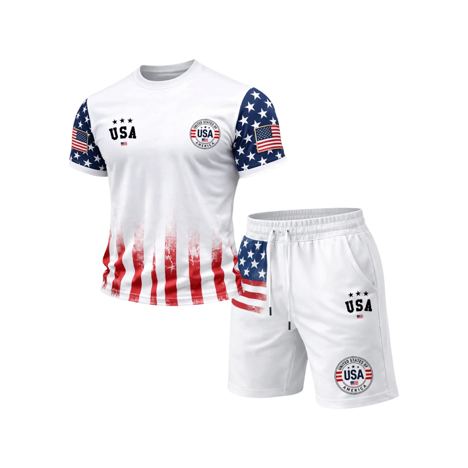 Men's Casual Navy Blue USA Printed Short Sleeved Round Neck T-Shirt & Shorts White Two Piece Set