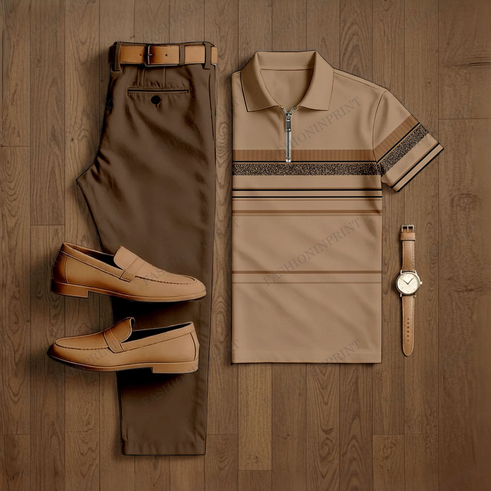 Men's Casual Red Brown Color Matching Striped Printed Short Sleeved Polo Shirt & Trousers Two-Piece Set