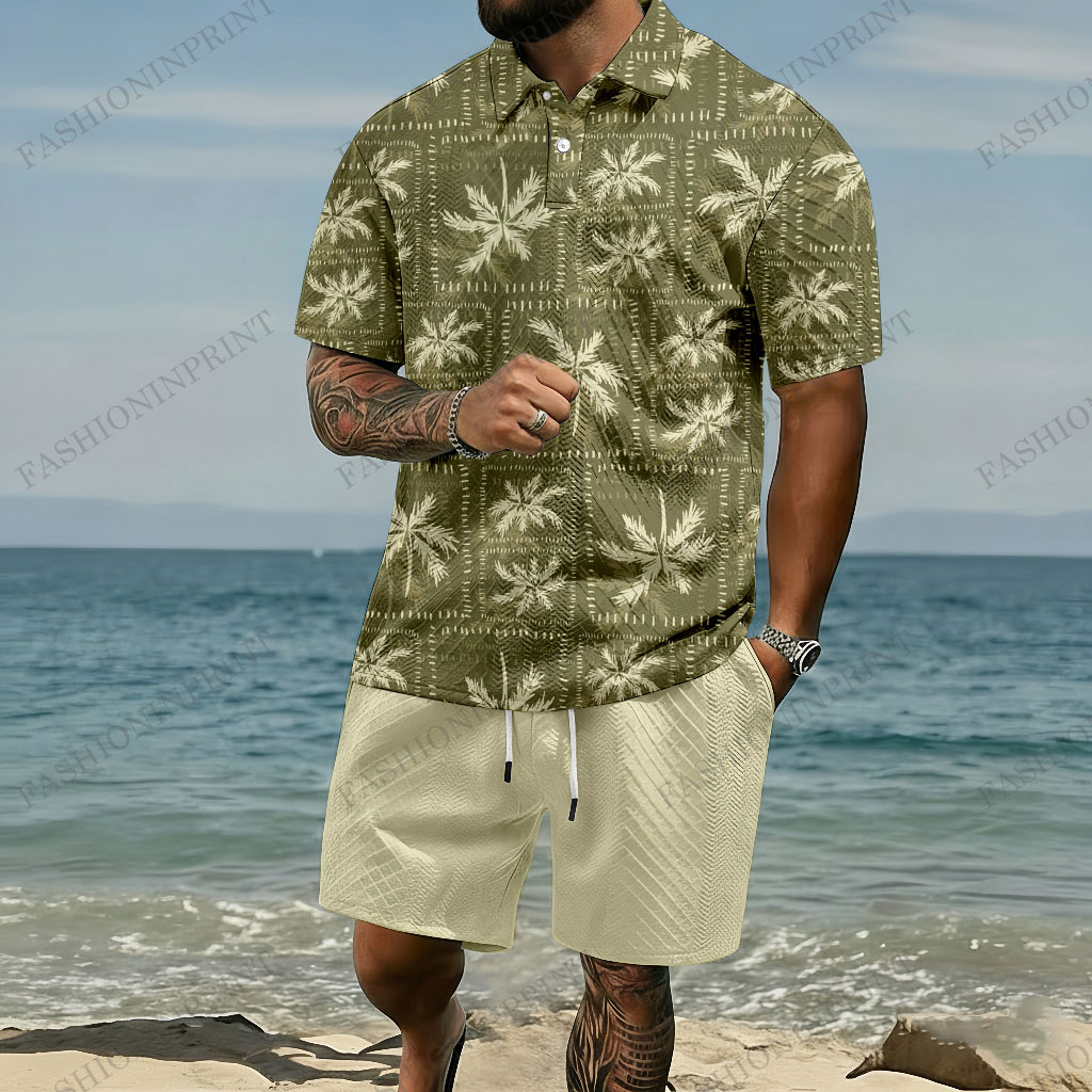 Men's Fashion Casual Hawaii Green & Khaki Green Tree Printed Short-Sleeved Polo Shirt & Shorts Two-Piece Set