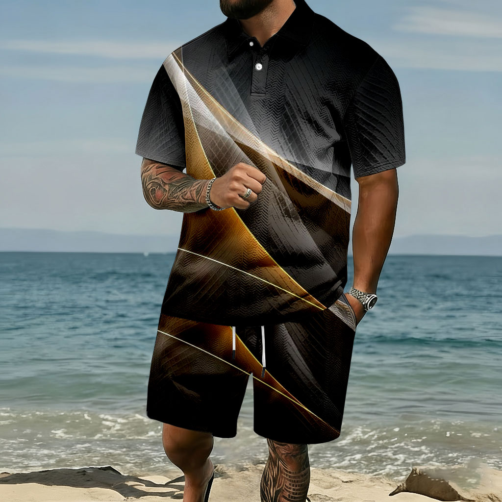 Men's Fashion Casual Black & Gold Color Matching Gradient Printed Short-Sleeved Polo Shirt & Shorts Two-Piece Set